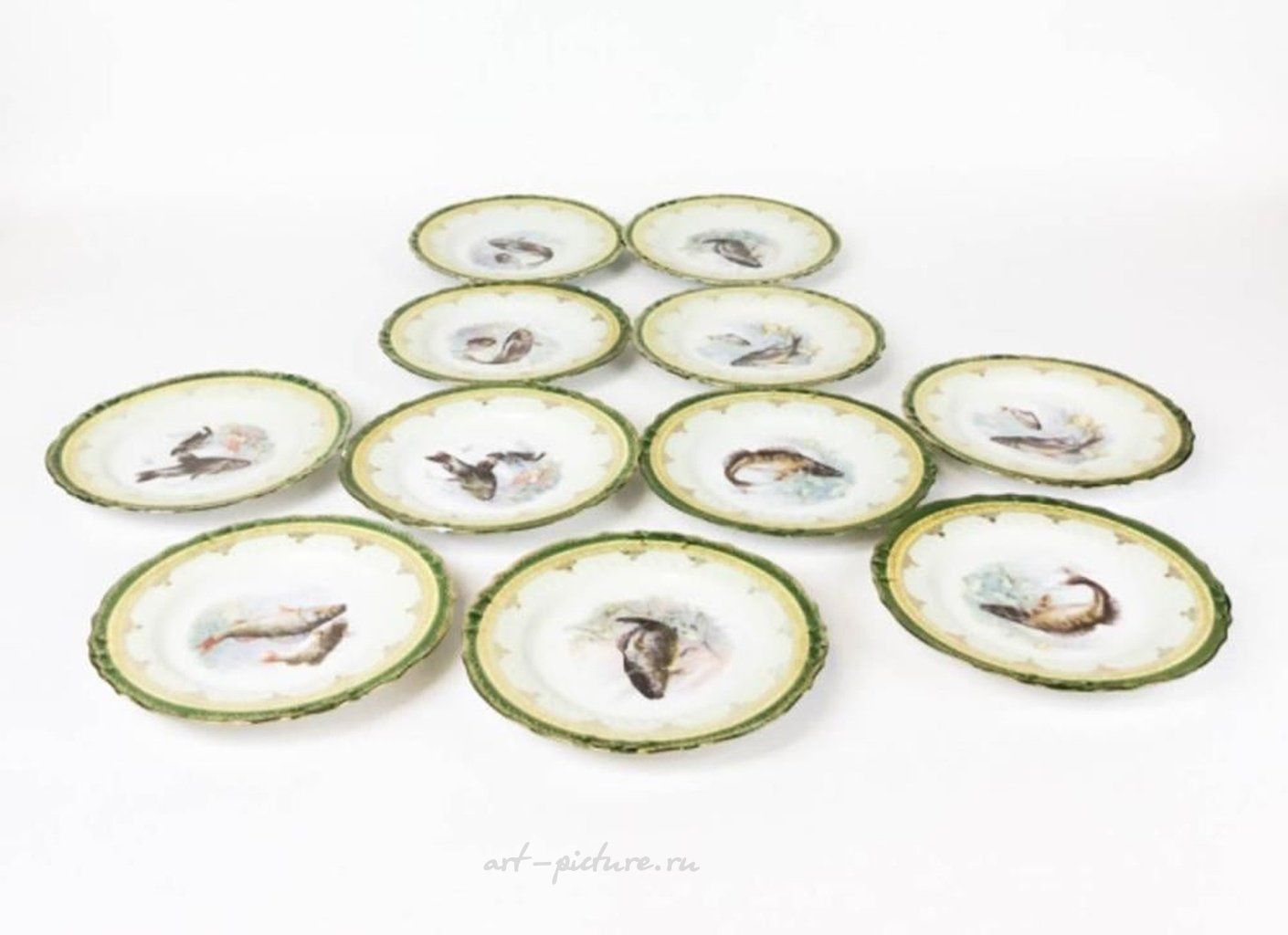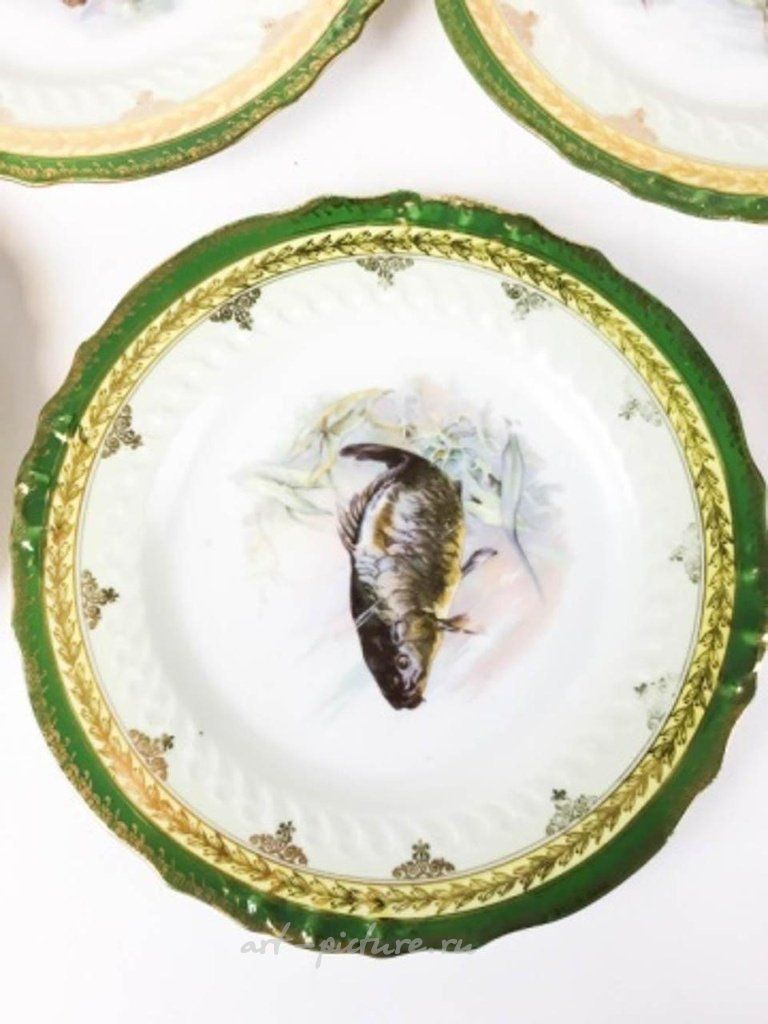 Ручная роспись австрийских фарфоровых тарелок с рыбной тематикой и маркой Royal Vienna в виде ульев. Каждая тарелка имеет диаметр 8 1/4 дюйма. Из 5 тарелок отслоились края.