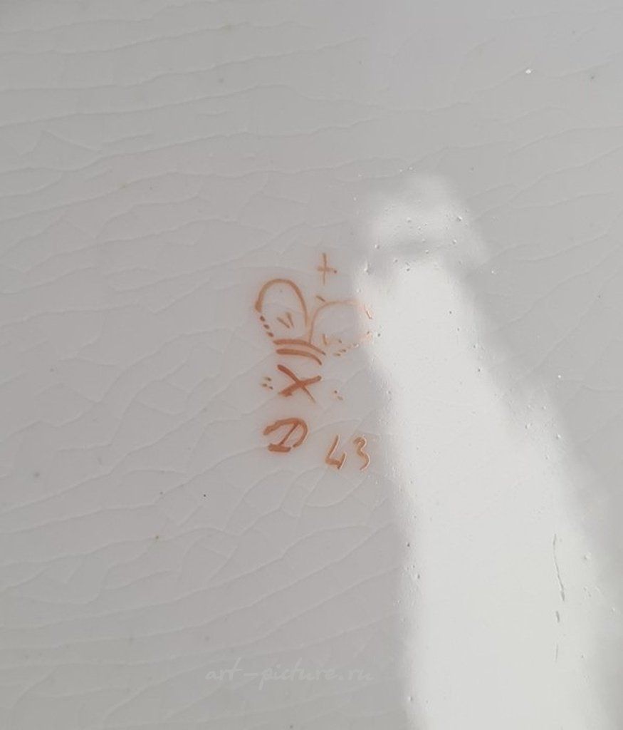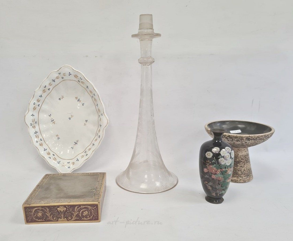 Фарфоровая тарелка Дерби конца 19 века имеет овальную форму с легкими складками. Она украшена васильками и имеет ширину 28 см. Венская фарфоровая столбовая подставка с неоклассическим узором из позолоты на бордовом фоне имеет диаметр 13,5 см. Также в комплекте есть гравированная стеклянная ваза эперна, небольшая японская клеймонная эмалированная ваза и каменная ствольная чаша. Всего в комплекте 5 предметов.