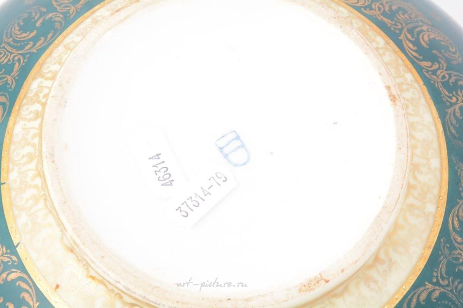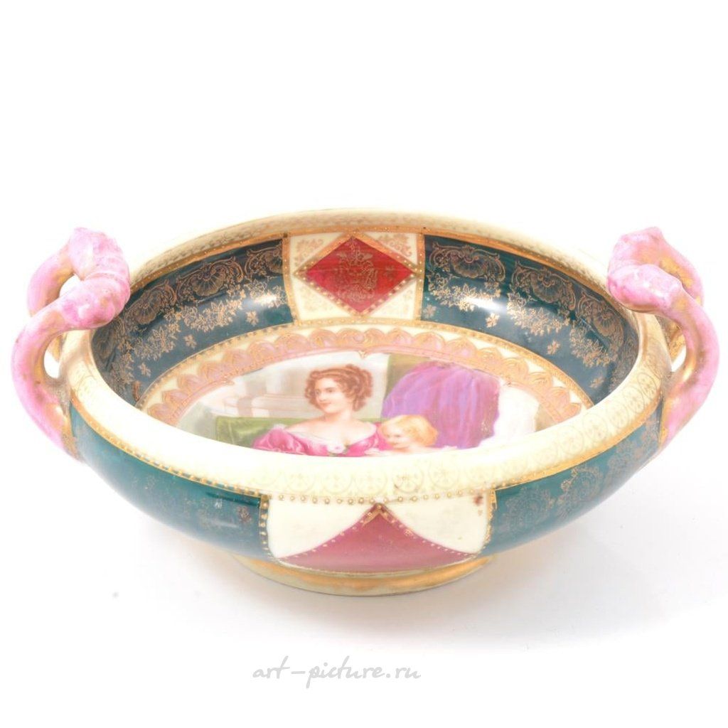 Роскошная чаша Королевской Вены с двумя ручками, перевернутым краем, в центре которой изображена мать с ребенком. Контуры чаши позолочены. Чаша имеет отметку "пчелиный улей" и диаметр 28 см.
