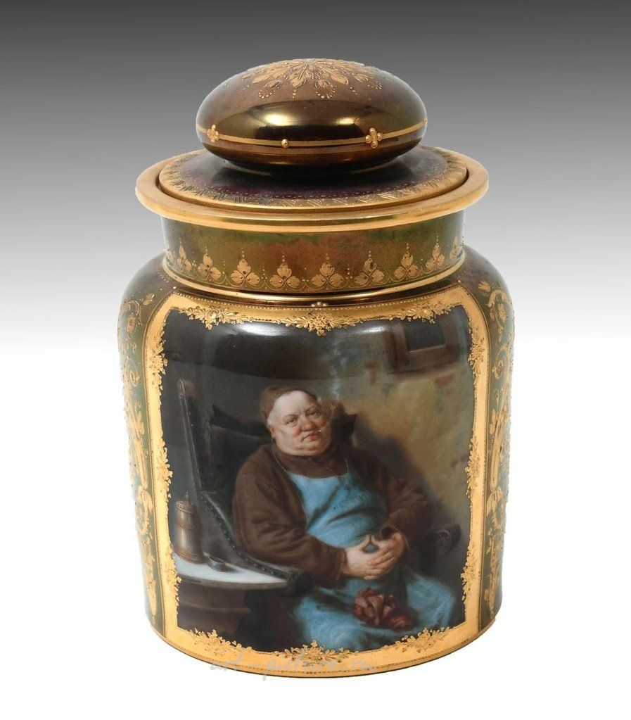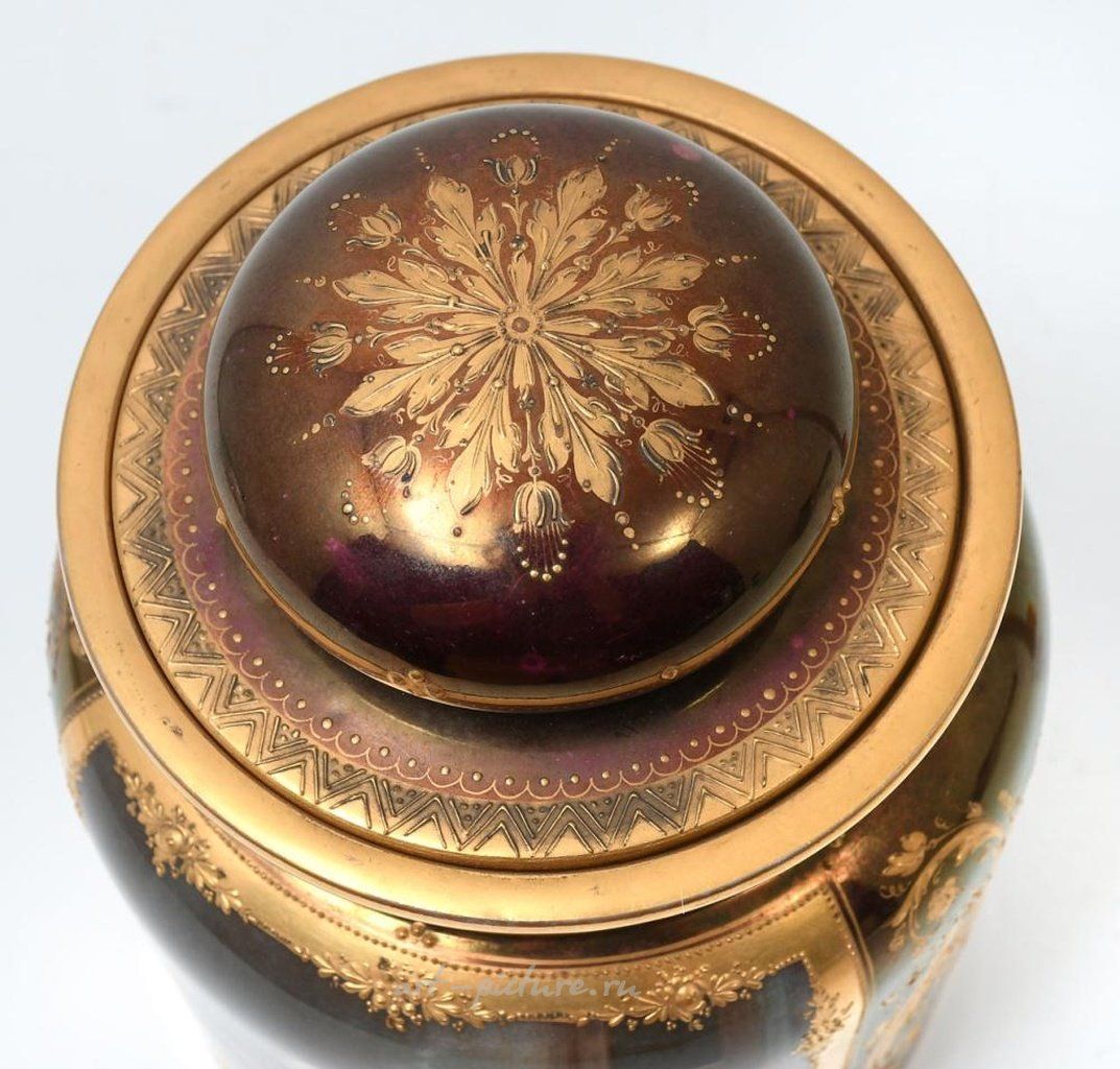 Шкатулка ROYAL VIENNA PORTRAIT: Прекрасная шкатулка Royal Vienna с шоколадно-коричневым фоном и великолепным портретом монаха, курящего сигару. На нем выгравированы выпуклые золотые эмалевые цветочные, листовые и бисерные узоры. Маркировка находится на нижней части. Размеры приблизительно 7,75'' в высоту и 5,5'' в ширину.