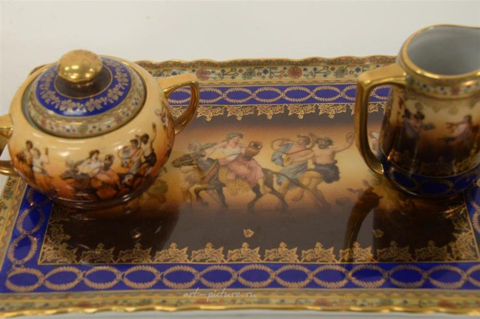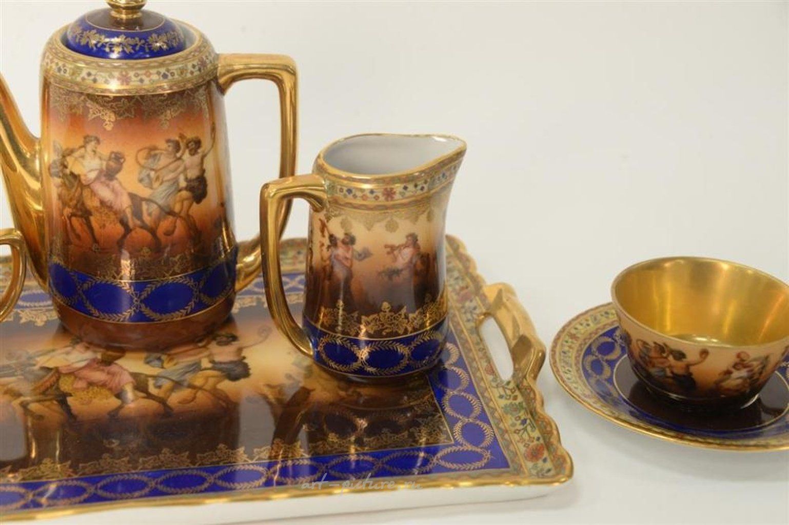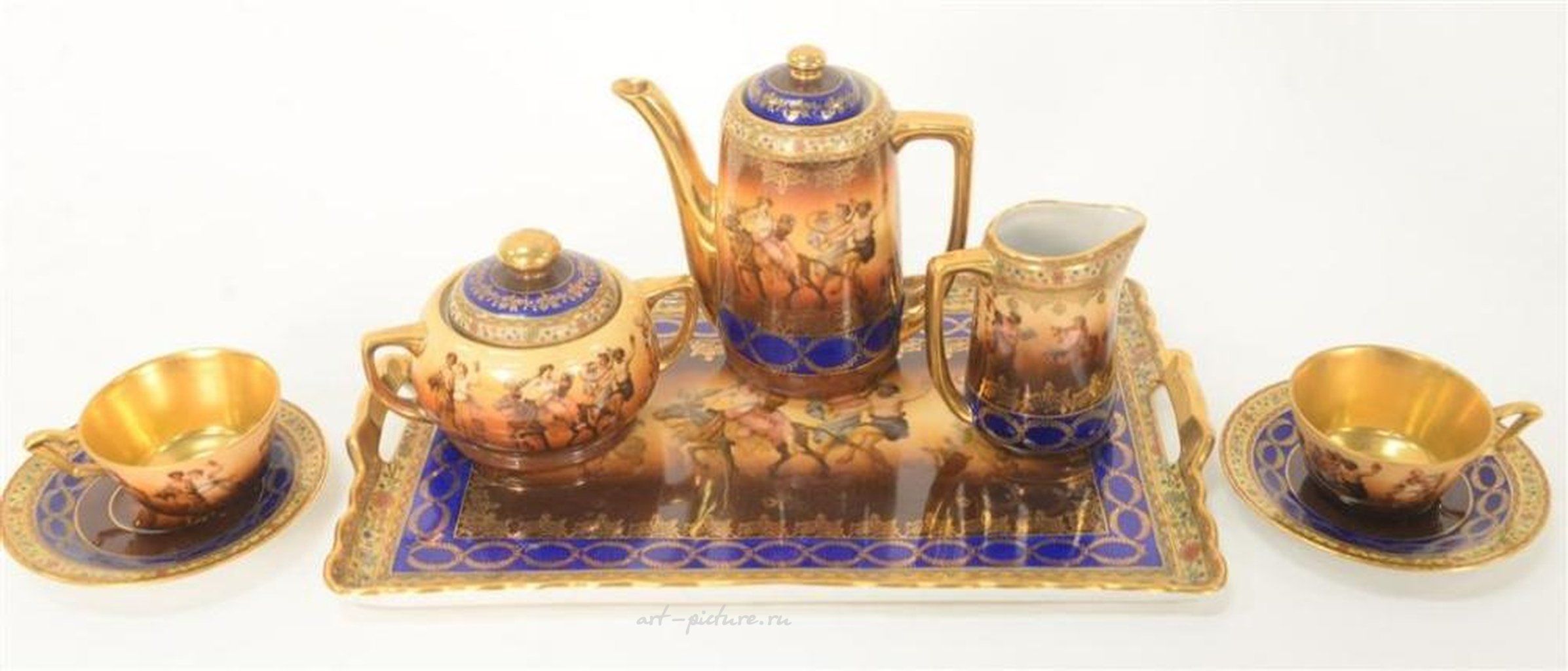 Восьмиэлементный группа чайного сервиза Royal Vienna включает в себя лоток для подачи, две чашки, два блюдца, одну сахарницу, один графинчик для сливок, а также чайник. Каждый из этих предметов помечен снизу. Высота чайника составляет 5 1/2 дюйма, а ширина лотка - 12 дюймов.