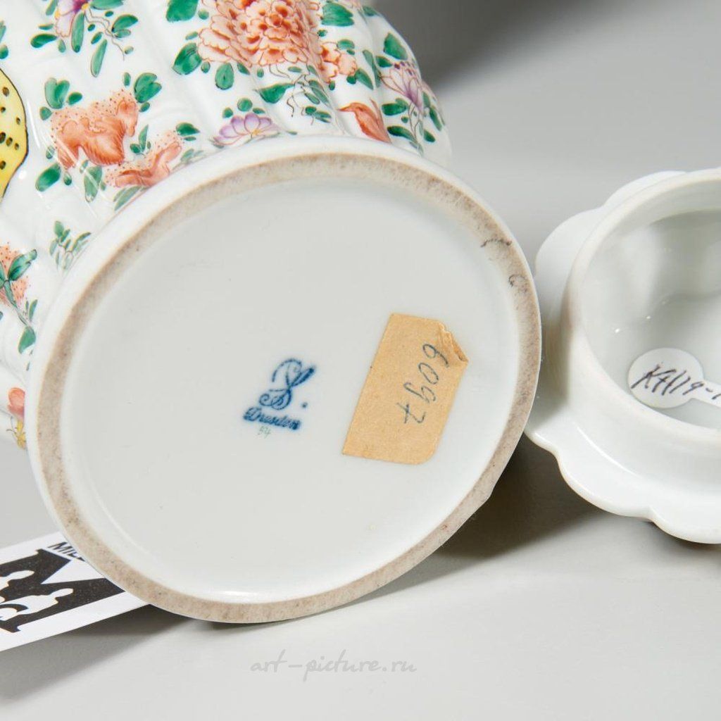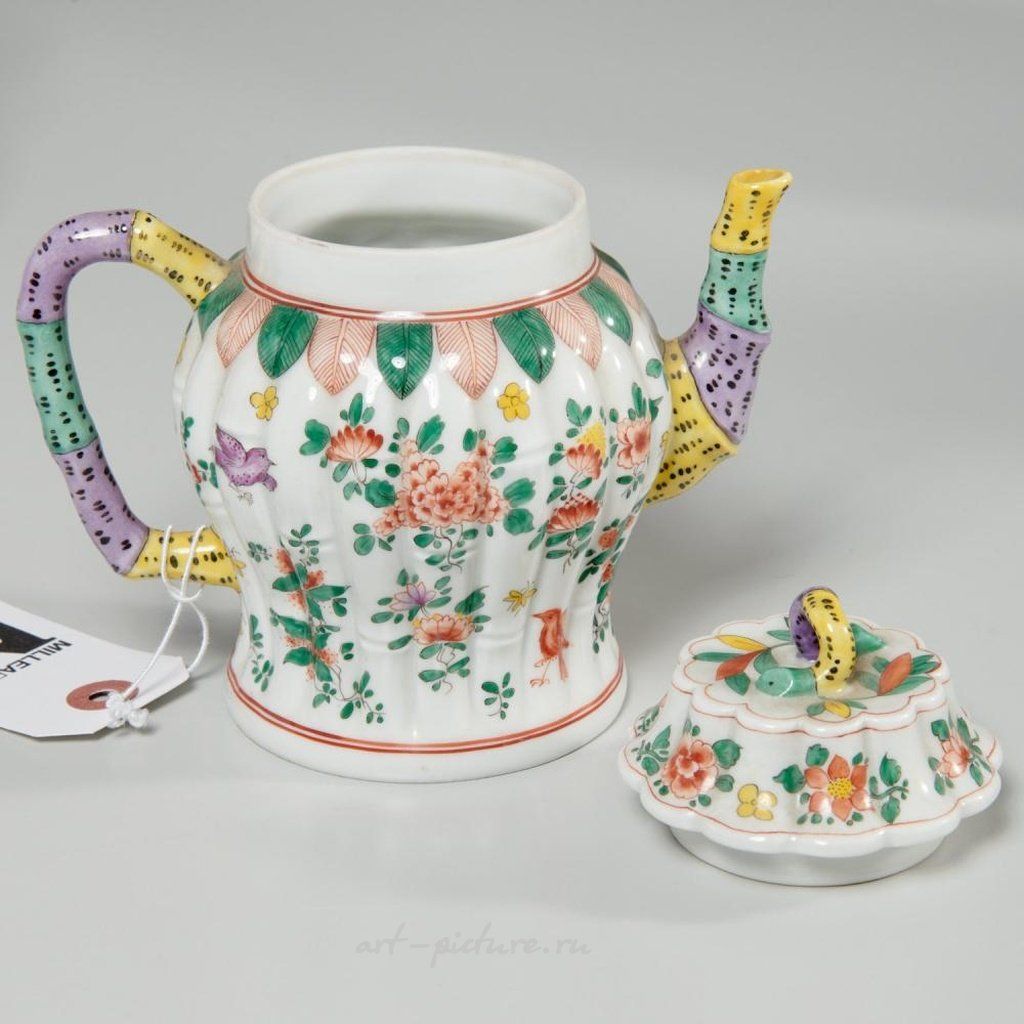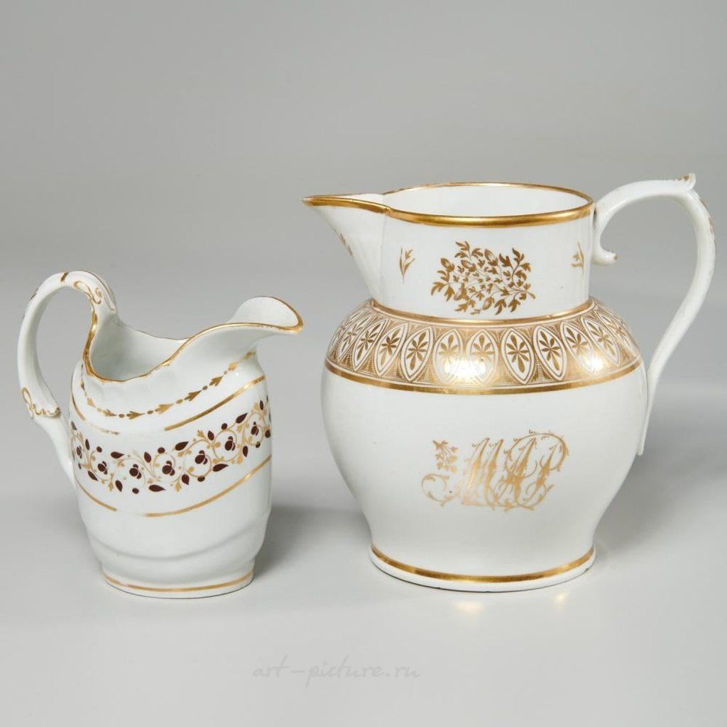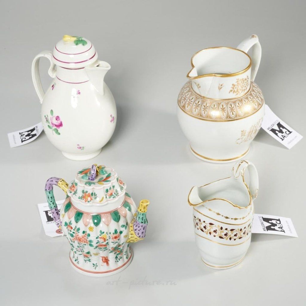 В 19/20 веке была популярна ручная роспись фарфора. В коллекцию входят следующие предметы: кофейник, украшенный цветочным узором из Королевского Вены и маркировкой в виде пчелиного улья; чайник в японском стиле из Дрездена; большой кремовый кувшин с позолотой и монограммой на боковой стороне, без маркировки; а также сливочник с позолоченным виноградным узором, также без маркировки. Самый малый размер составляет 4.75" в высоту, 4.5" в ширину и 2.75" в глубину. Самый большой размер - 6" в высоту, 6" в ширину и 4.25" в глубину.