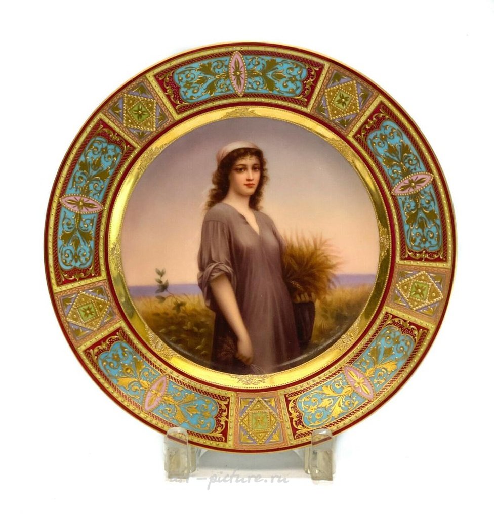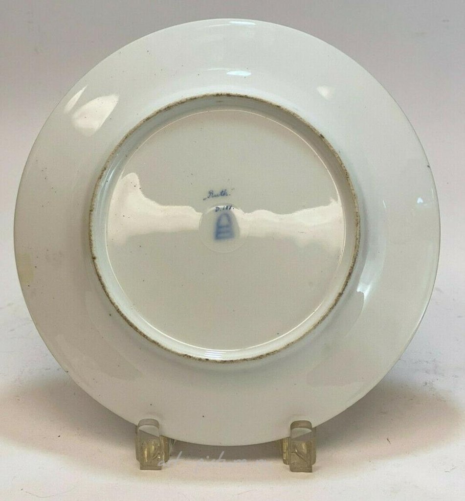 Royal Vienna, Австрия. Ручная роспись фарфоровой кабинетной тарелки с изображением Рут, примерно 1900 года. Центральная часть тарелки изображает Рут, держащую пшеницу. Художник Беуте подписался на нижнем крае. Маруново-красное основание с голубыми и розовыми акцентами. Позолоченные пуговичные орнаменты по всему краю. На обратной стороне имеется королевская венская пчелиная печать. Вес приблизительно 1 фунт. Размеры около 9,5 дюйма в диаметре. Стоимость доставки по стране - 35 долларов.