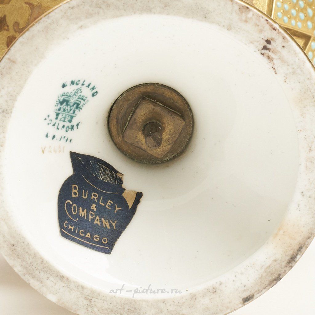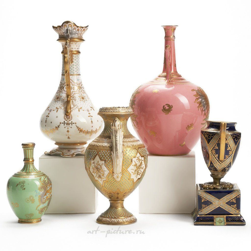 Группа из пяти эмалированных фарфоровых ваз, включающая одну двухручную золоченую фарфоровую вазу фирмы Copeland; одну вазу кобальтового цвета фирмы Royal Vienna с аллегорическим изображением по всему корпусу, имеющую синюю марку биеннале под глазурью; одну двухручную фарфоровую вазу фирмы Coalport; одну розовую грушевидную вазу из фарфора фирмы Royal Crown Derby с узкой шеей; и одну маленькую вазу фирмы Royal Crown Derby. Высота вазы Copeland: 9 дюймов. Высота вазы Royal Vienna: 6 1/2 дюймов. Высота вазы Coalport: 7 1/2 дюймов. Высота розовой вазы Royal Crown Derby: 9 дюймов. Высота маленькой вазы Royal Crown Derby: 5 дюймов.