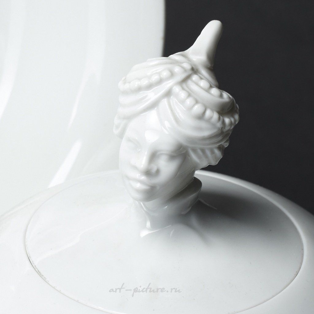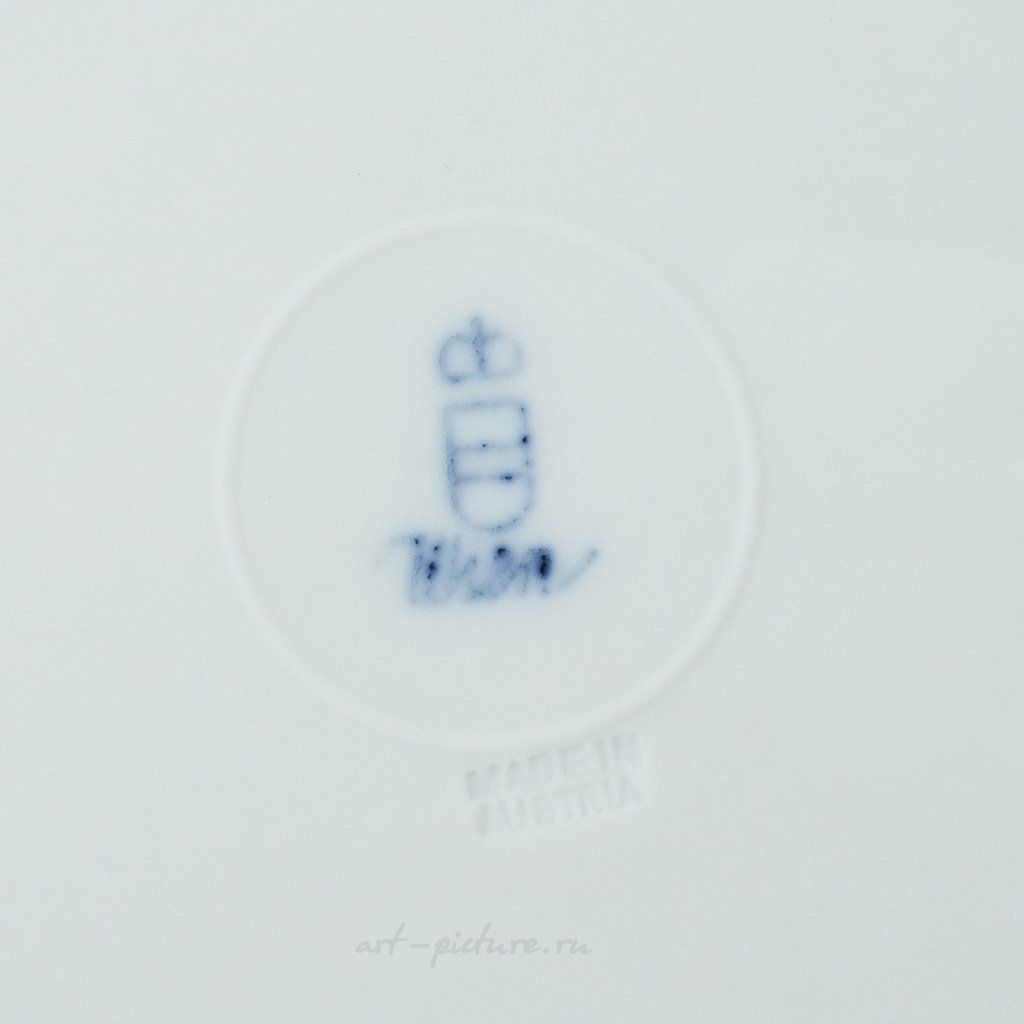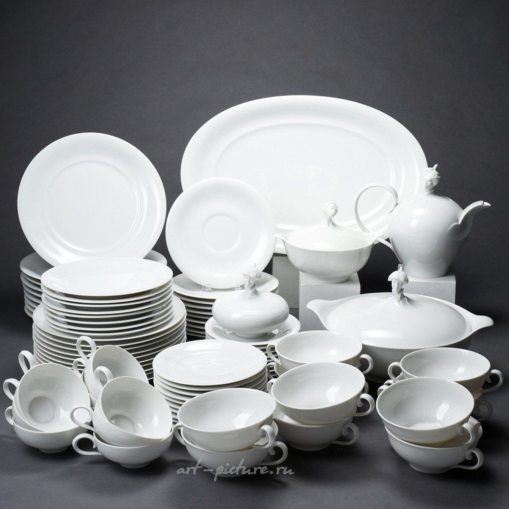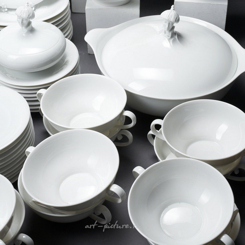 Ена Роттенберг (румынка, 1893-1952) создала белый фарфоровый набор для обеда для Аугартена в Вене, Австрии. В набор входит девять чашек для чая, восемь блюдец для кофе эспрессо, десять блюдец для чашек, десять блюдец, одна покрытая сахарница, один покрытый чайник, восемь аппетитных тарелок, десять супных тарелок, десять обеденных тарелок и девять обеденных тарелок. Также в наборе присутствует один поднос, одна маленькая покрытая салатница и одна большая покрытая салатница. Каждый предмет имеет отметку "Изготовлено в Австрии" на дне и клеймо из фарфора королевского Вены с изображением улья, синее якорное клеймо и отметку "Вена". Крышки салатниц, сахарницы и чайника имеют фигурные головки. Высота предметов варьируется от 3/4 дюйма до 7 дюймов, а ширина - от 4 1/2 дюйма до 17 дюймов.