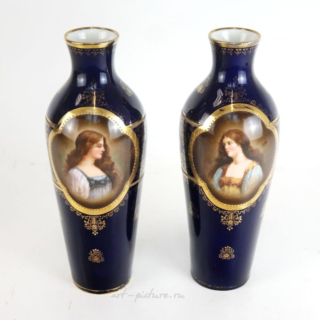 Две австрийские портретные вазы из королевской Вены с синим фоном, украшенные золотыми акцентами и центральными картиными портретами. Вазы имеют голубую глазурь и марки пчелиных ульев на основаниях. Размеры: высота - 10 3/4 дюйма, диаметр - 4 1/4 дюйма. Присутствуют признаки износа и потери декора.