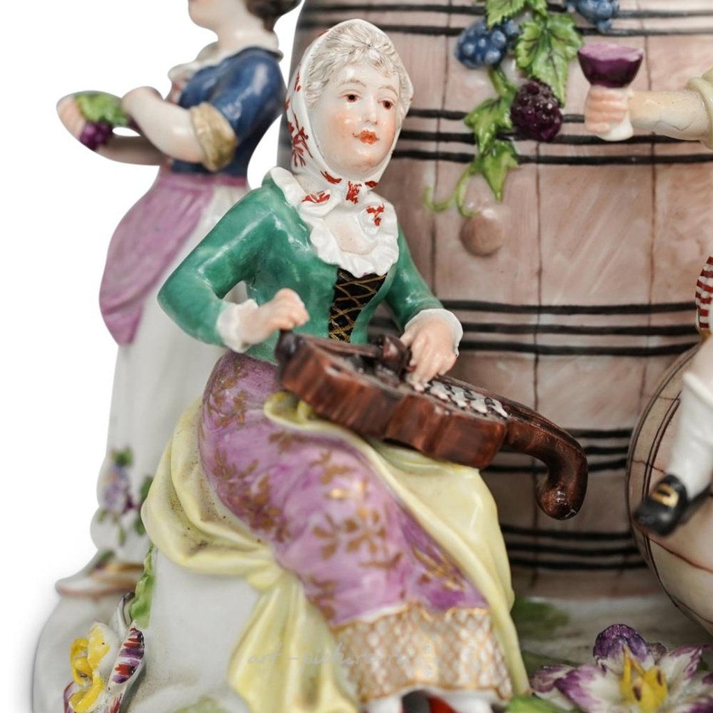 ОПИСАНИЕ: Антикварная группа из фарфора Роял Вена изображает большую центральную винную бочку с танцующими и пьющими фигурами на праздничной сцене, украшенной цветочными мотивами. Подписана снизу фирменным знаком Royal Vienna Beehive и номером 5191. ВОЗРАСТ: 19 век. ПРОИСХОЖДЕНИЕ: Австрия. РАЗМЕРЫ: Высота: 11,5 дюймов, Диаметр: 8,5 дюймов. СОСТОЯНИЕ: Отсутствует рука у верхней фигуры, также отсутствует смычок банджо.