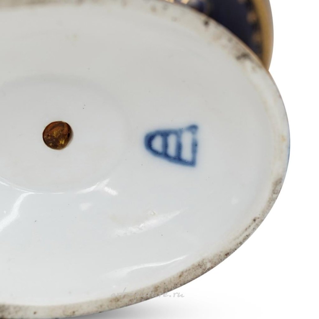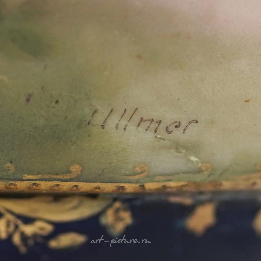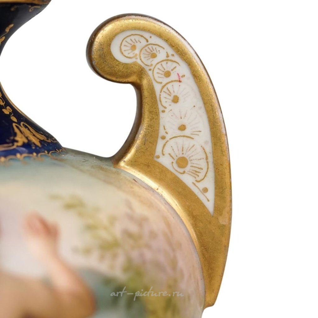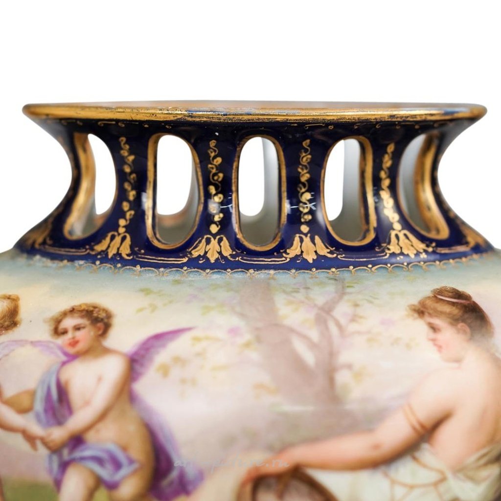 ОПИСАНИЕ: Ваза Royal Vienna, украшенная в центре изображением молодой девы, окруженной ангелочками-херувимами, расписанная кобальтовой синью по основанию и ретикулированной шейке, дополнительно украшенная золотыми мотивами и изогнутыми ручками. Подписана снизу знаком пасечки Royal Vienna. ГОД СОЗДАНИЯ: начало XX века. ПРОИСХОЖДЕНИЕ: Австрия. РАЗМЕРЫ: Высота: 8 дюймов, Ширина: 7,75 дюймов.
