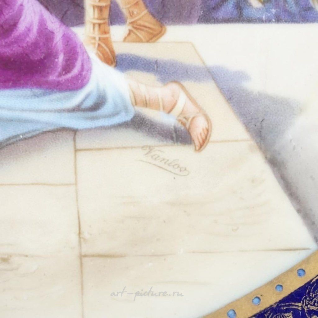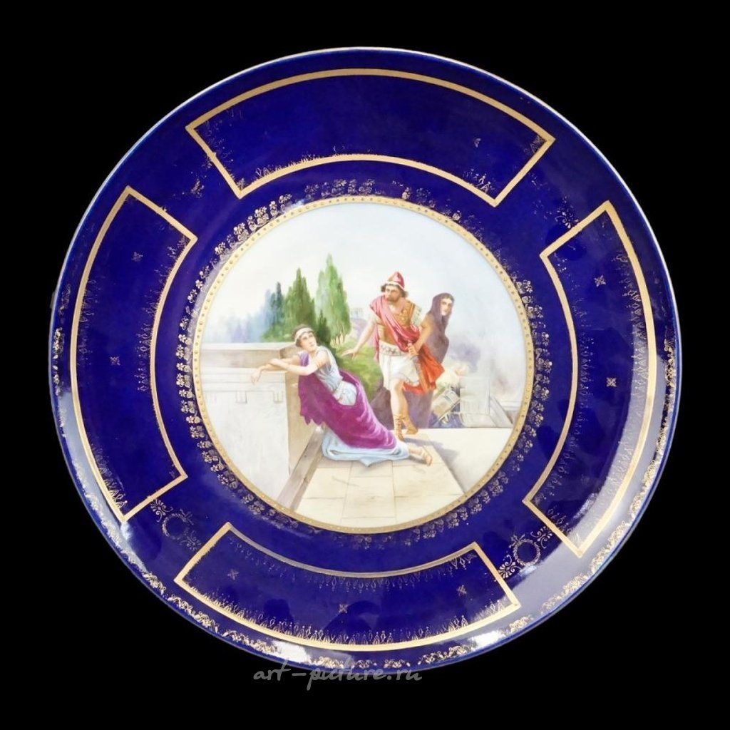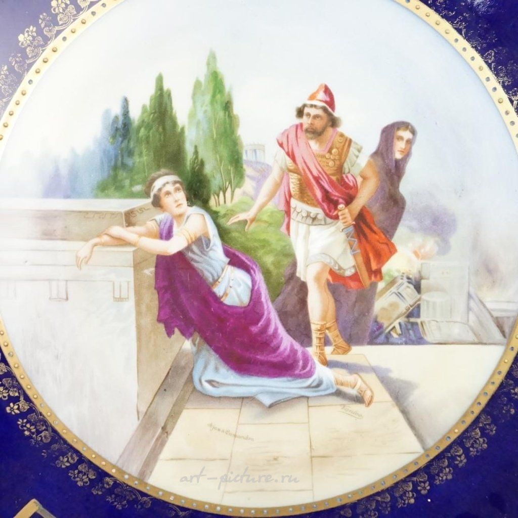 Настенная тарелка, росписанная золотом и кобальтом, Royal Vienna с неоклассической портретной сценой. Подписана на обратной стороне. Портрет помечен "Аякс и Кассандра" по Ванлоу. Размеры составляют 17-1/8 дюймов. Состояние: имеется потертость на золотой поверхности. Оценка: от $100.00 до $300.00. Доставка по США осуществляется отдельно.