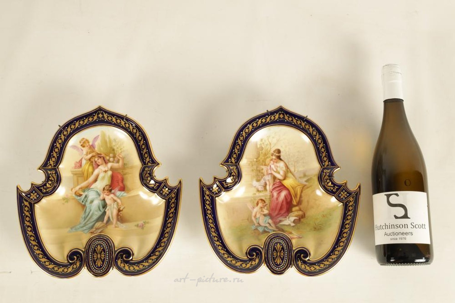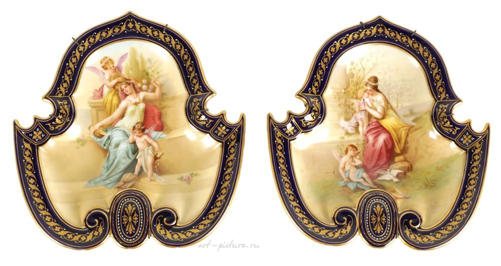ДЕКОРАТИВНАЯ ПАРА ВЫПУКЛЫХ ВИЕНСКИХ ТАРЕЛОК ПОЗДНЕГО XIX ВЕКА В СТИЛЕ ВИЕННСКОГО СТИЛЯ с формой цветов, декоративным узором и богато позолоченными королевскими синими краями, ограничивающими фигурные эпицентры с изображением молодых дам и амуров на садовом фоне - подпись Forster (ширина 24 см, высота 25,5 см).