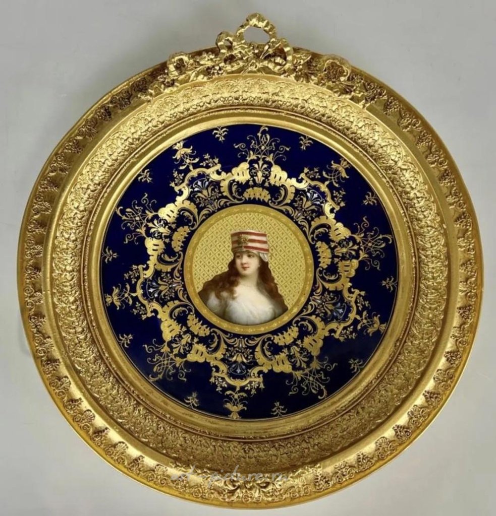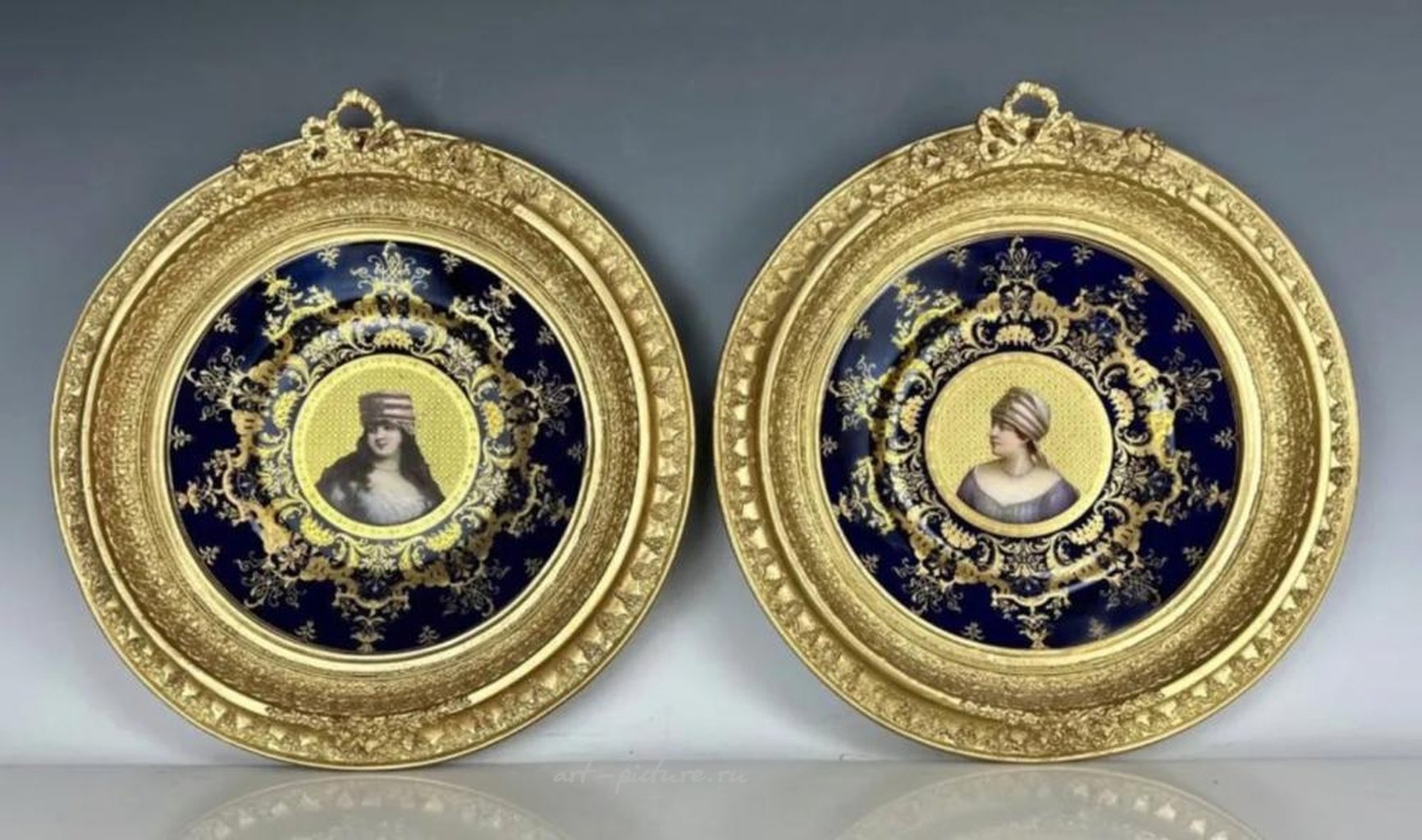 Около 1900 года. Диаметр тарелок без рамки составляет 10 дюймов. Оба находятся в хорошем состоянии. Они оцениваются в $2,500-3,000.