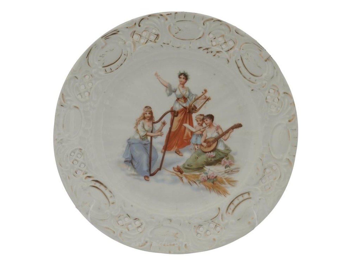 Четыре старинные антикварные фарфоровые декоративные тарелки в стиле Ар Нуво, включая тарелку Royal Vienna с мотивом цветов и классическим центральным рисунком, подписанным Буше, тарелку из фарфора Victoria Austria с изображением женщин, круглую пробивную тарелку с изображением муз, играющих на музыкальных инструментах, и декоративную десятиугольную тарелку с пробивным бордюром и женским портретом. Два предмета имеют маркировку на дне. По времени примерно 1900-е годы. Антикварные фарфоровые декоративные тарелки для коллекционеров.