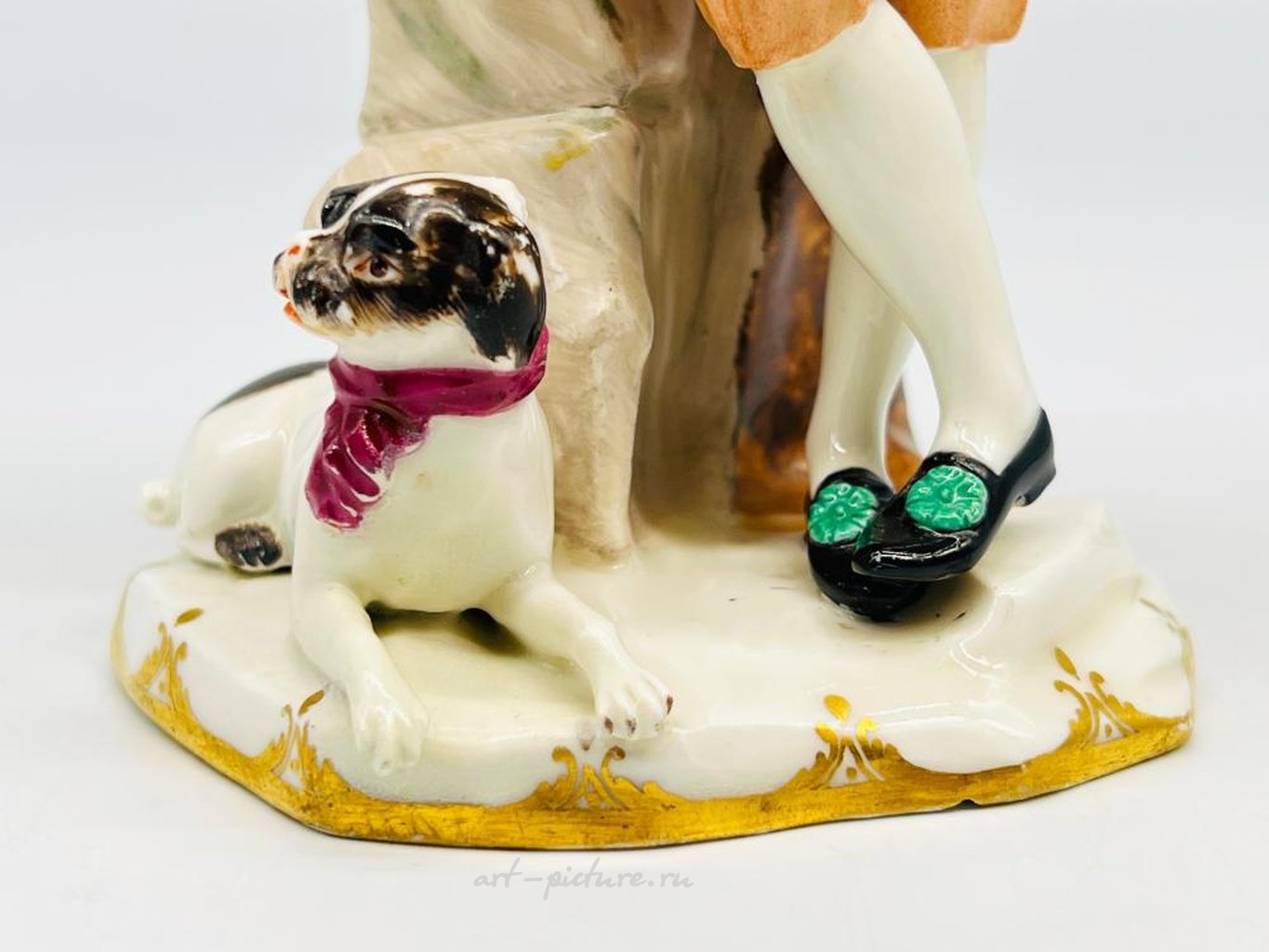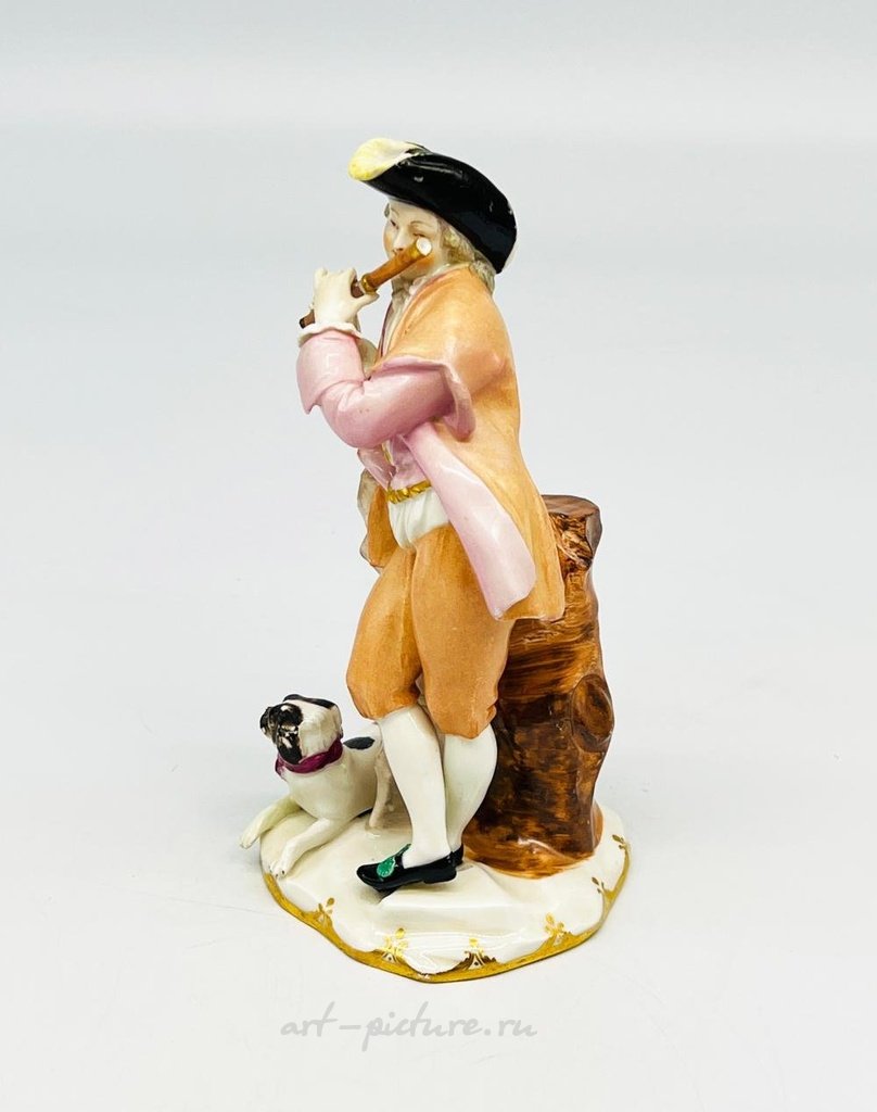 Антикварная фарфоровая фигурка Royal Vienna. На нижней стороне имеется ручная нанесенная марка Вены под глазурью - голубой щит, который иногда называют эмблемой улья. Также на фигурке присутствует оттиск буквы Р, который, возможно, является маркой даты. Фигурка изображает мужскую фигуру 18-го века, играющего на флейте, с собакой у его ног. После того, как Императорская и Королевская фарфоровая мануфактура перешла в имперскую собственность, она начала помечать свой фарфор "бинденшильдом", или как его сейчас обычно называют "эмблемой улья". Марка наносилась на нижнюю сторону изделия синей подглазурной росписью, а в 1783 году мануфактура также стала добавлять марки даты. Бинденшильд наносился вручную и не был симметричным. Приблизительный размер фигурки: 3 3/4" X 4" X 7 1/2".