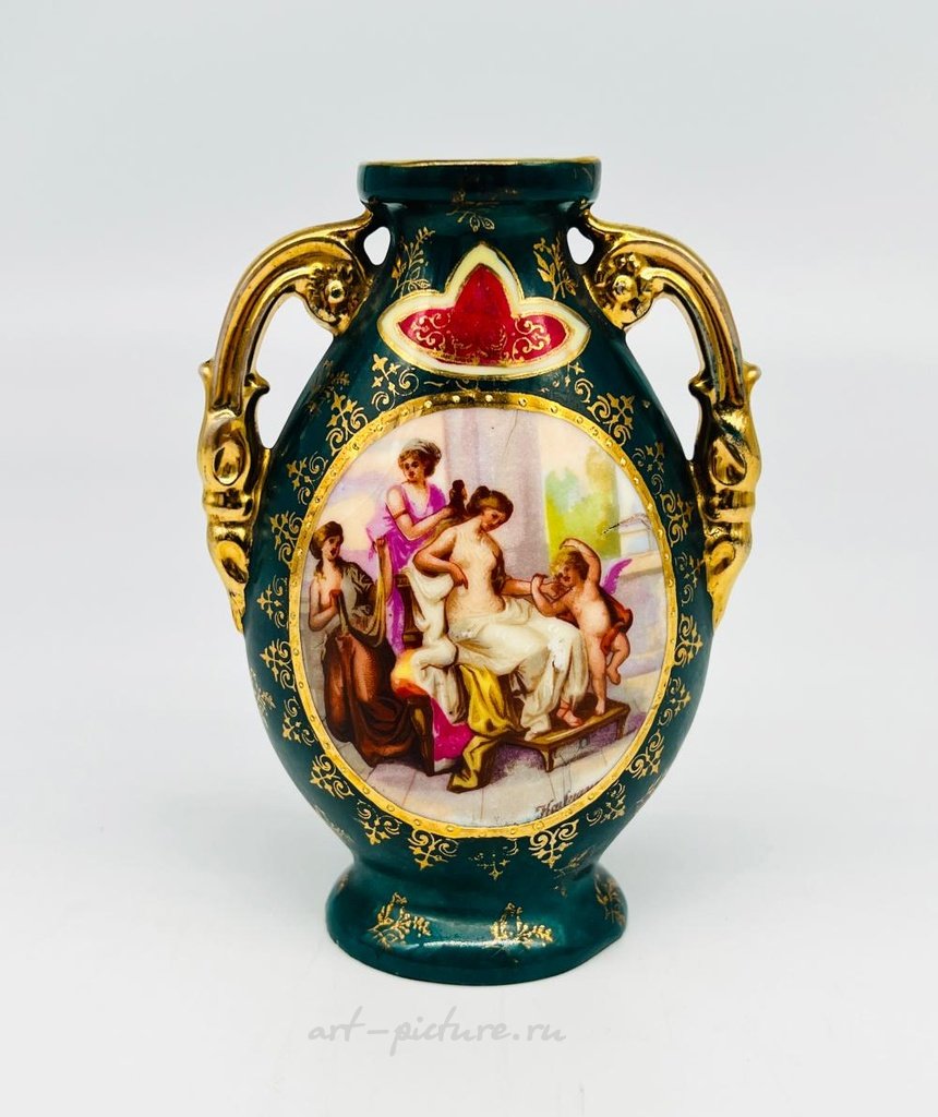 Античная австрийская ваза из фарфора в стиле Королевской Вены. Ручная роспись зеленой вазы с декором греко-римских фигур, золотыми позолоченными двойными ручками и акцентами. Нижняя правая часть фигур подписана вручную, кажется, это "Хайманн". Венское клеймо на нижней стороне, синий щит (штамп с пчелкой) нанесен под глазурью, надпись "Австрия". Приблизительный размер: 5" H x 4" W x 2.5" D.