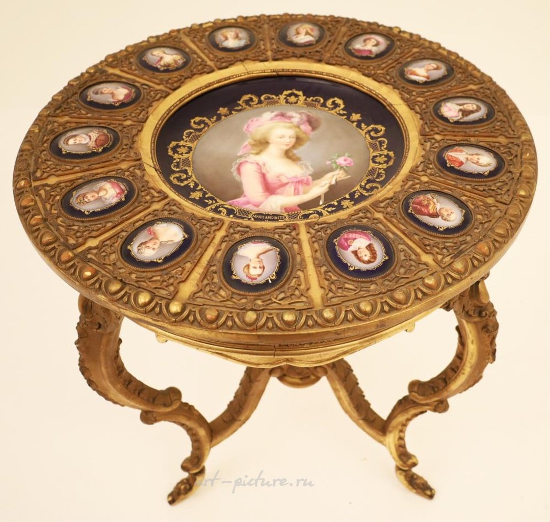 Золотистый стол в салоне в стиле Людовика XV, изготовленный из дерева с нанесением золотистого покрытия, имеет кобальтовую и поднятую золотую пластину с портретом Марии-Антуанетты в центре. Пластина окружена 16 индивидуальными пластинами французской знати, которые помечены синим ульем с обратной стороны от Royal Vienna. Высота стола составляет 31 дюйм, а диаметр - 27 дюймов. Условия этого столика включают некоторые линии разделения в верхней части деревянного топа в центральном медальоне. Из видимых дефектов, похоже, имеются некоторые области реставрации/перезолочивания вокруг подкладки. Все фарфоровые пластины и центральный зарядник, похоже, находятся в хорошем состоянии, без сколов, повреждений и трещин.