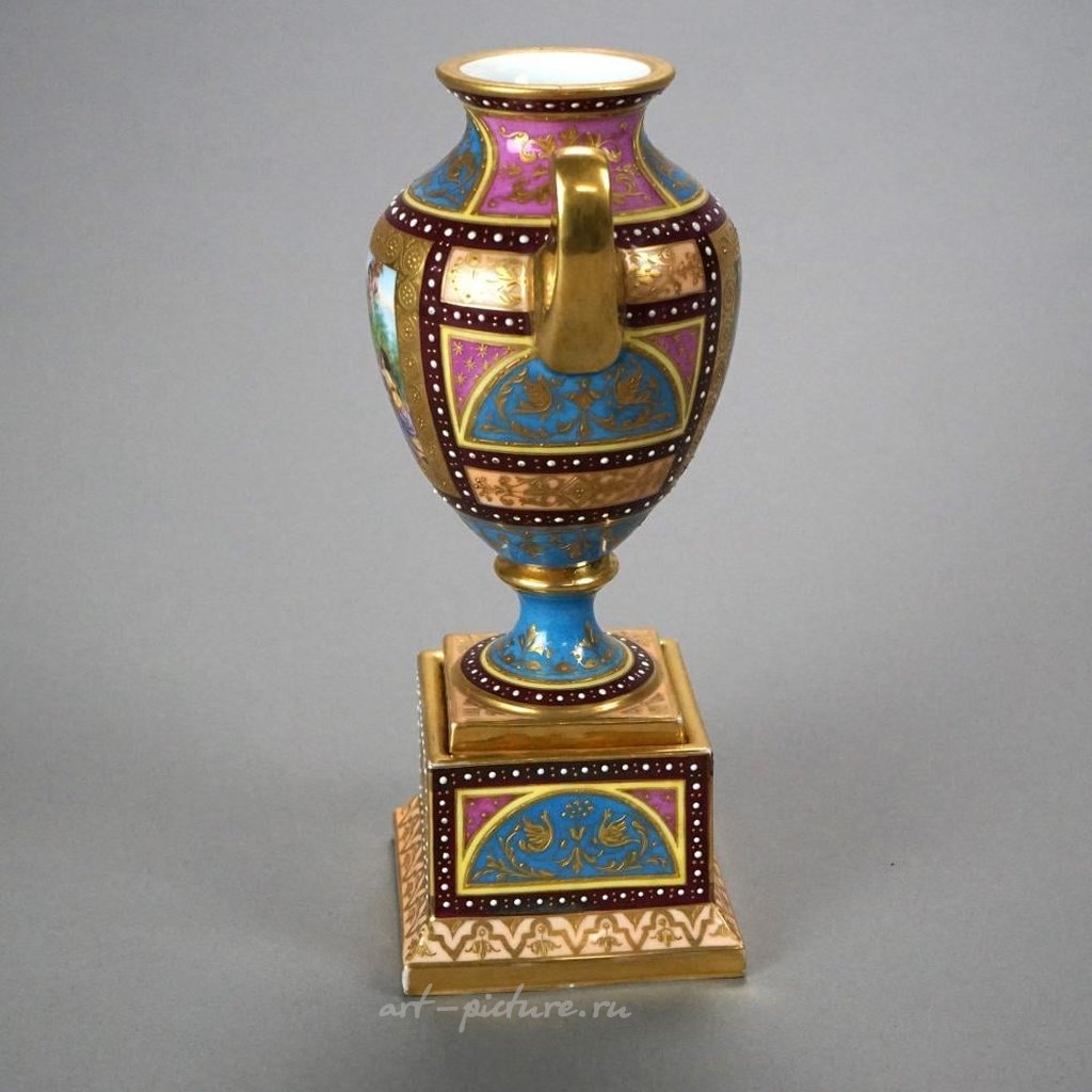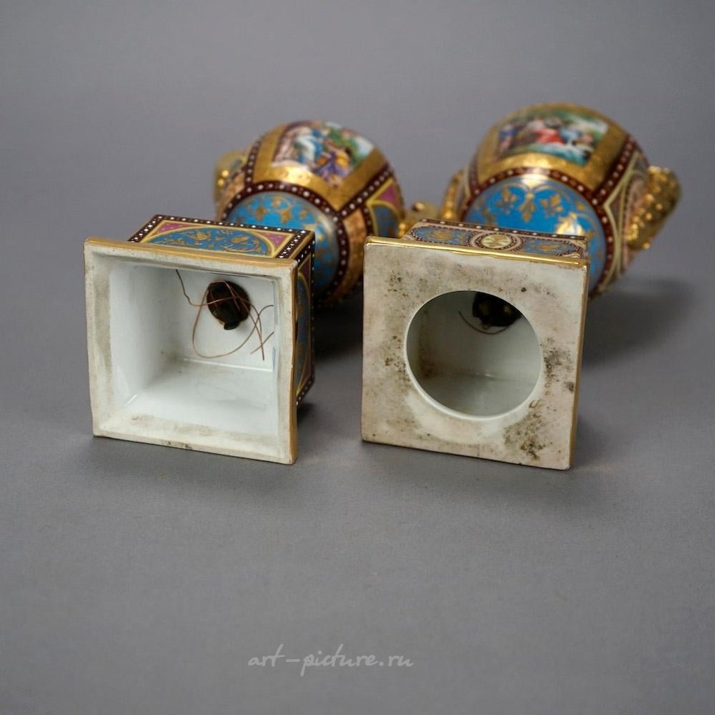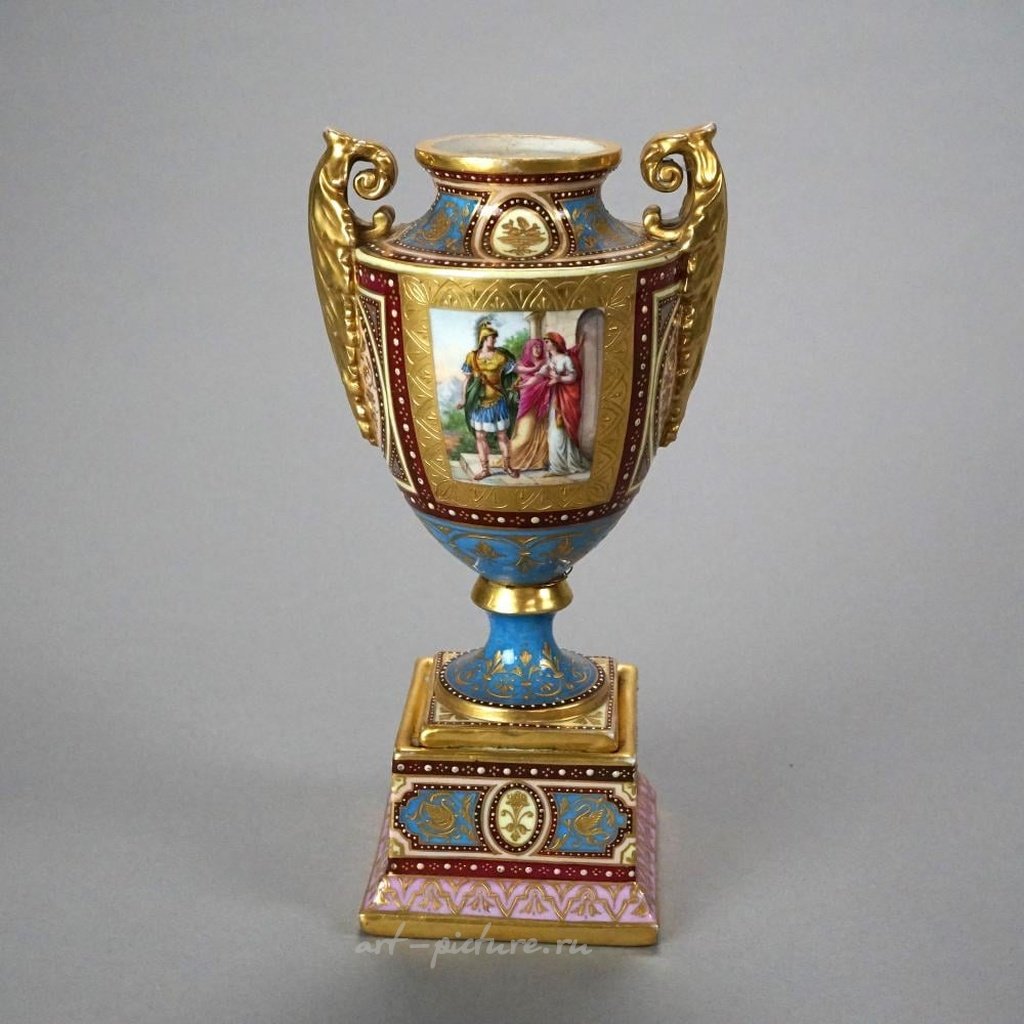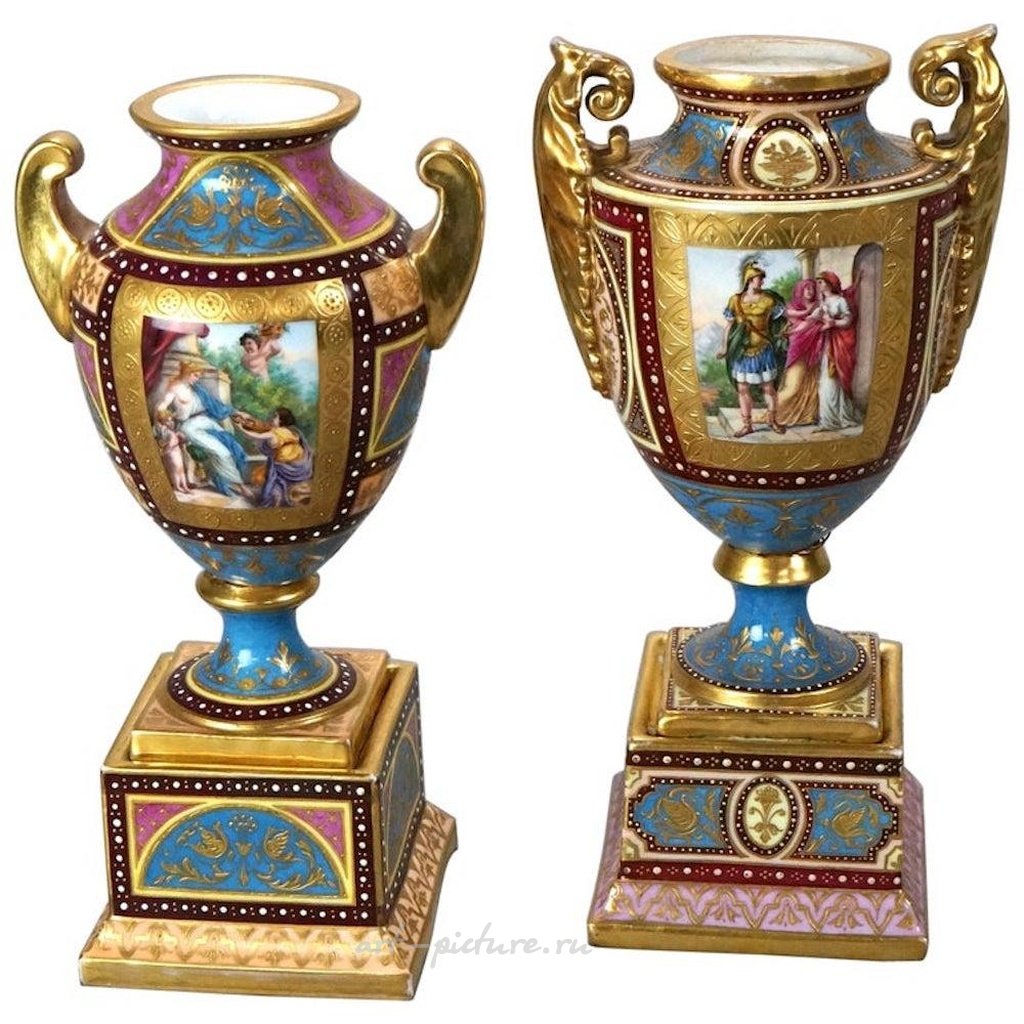 Антикварная пара австрийских ваз имеет фарфоровую конструкцию с ручными жанровыми сценами и позолоченными акцентами. Вазы оснащены двойными ручками, при этом одна из ваз имеет марку производителя "Royal Vienna beehive" на основании, как показано на фотографии. Вазы существенно похожи, но не идентичны. Они были изготовлены примерно в 1890 году. Размеры: большая ваза - высота 8,5 дюйма, ширина 4,25 дюйма, глубина 3,5 дюйма; меньшая ваза - высота 8,25 дюйма, ширина 3,25 дюйма, глубина 3,25 дюйма.