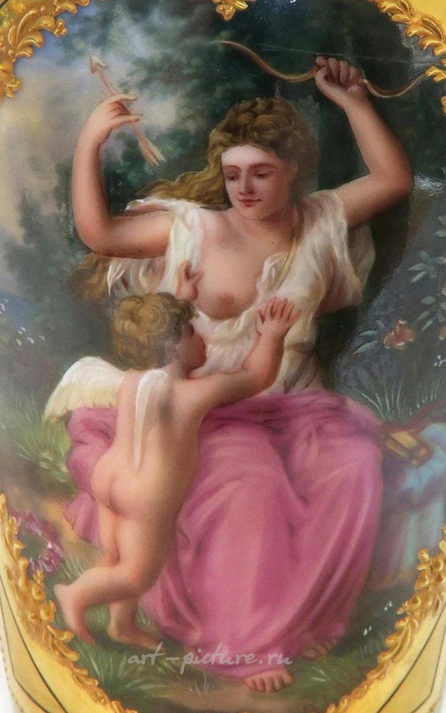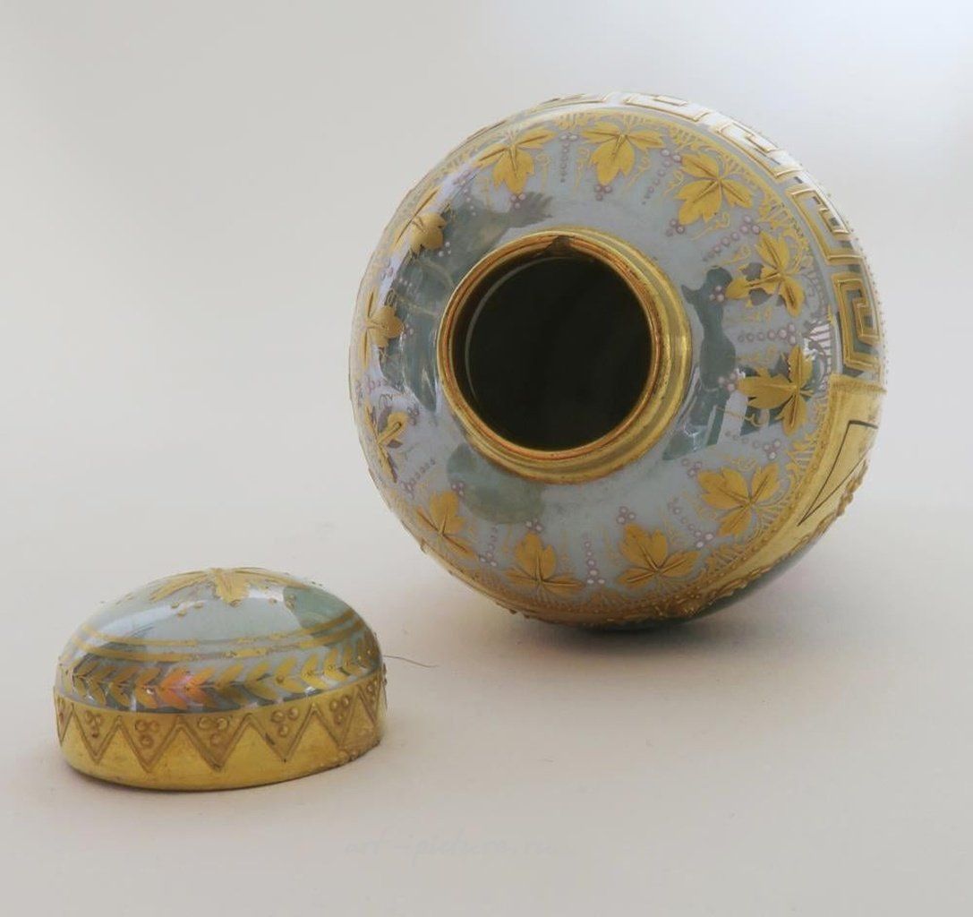 В XIX веке была создана австрийская ручная роспись королевской виенской фарфоровой вазы с крышкой. Ее высота составляет 5 3/4 дюйма, а диаметр - 2 1/2 дюйма.