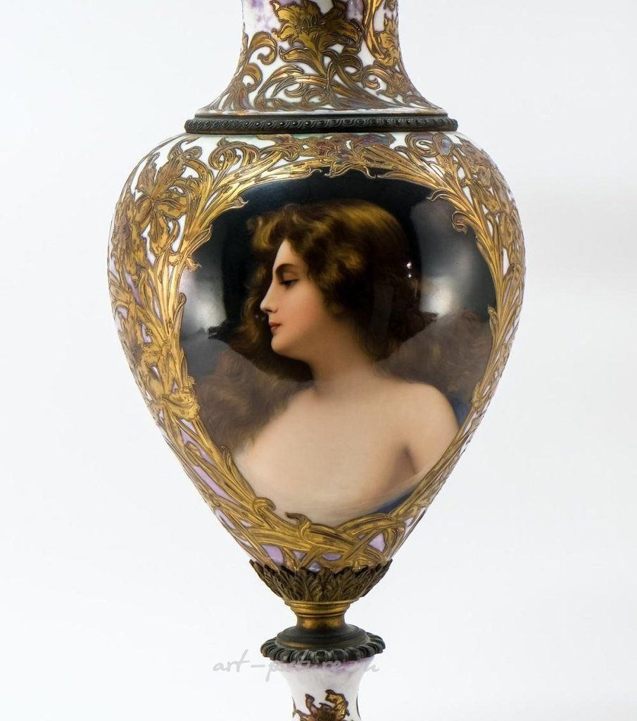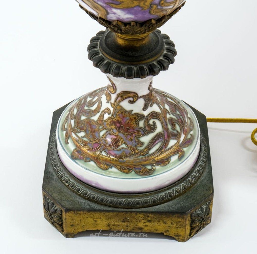 Трехсекционная фарфоровая портретная лампа с изображением головы и плеч женщины. Художник подписал неразборчиво. Ручная роспись над сверхглазурной голубой маркой улья на основании. Рельефная золотая декорация с подцветкой на фоне исчезающего фиолетового перелива. Некоторая потеря поверхности под креплениями, без ремонта, но есть некоторые поверхностные повреждения и следы использования. Лампа имеет высоту 28 дюймов, общая высота составляет 42 дюйма. Ключевые слова: Австрия, австрийский, антикварное.