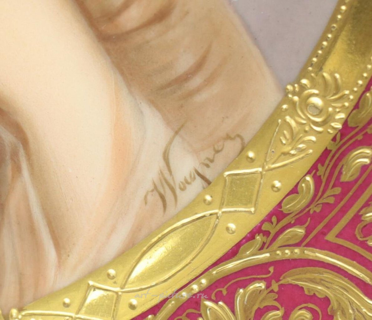 Роскошная пластика с ручной росписью виенского фарфора. "Epheu", примерно 1900 года. На портрете изображена темноволосая красавица в коричневой одежде и с лавровым венком на голове. В правом нижнем углу находится подпись Вагнера. Края тарелки имеют бордовый цвет с позолоченными растительными узорами и бисерными украшениями. На нижней стороне расположен пчелиный улей королевской Вены. Вес приблизительно 1 фунт. Размеры примерно: диаметр 9,5 дюйма.