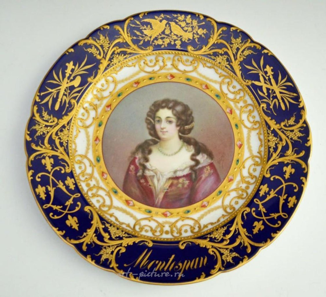 Золоченая портретная тарелка с бюстом любовницы Людовика XIV Мадам де Монтеспан имеет диаметр 10,25 дюйма.