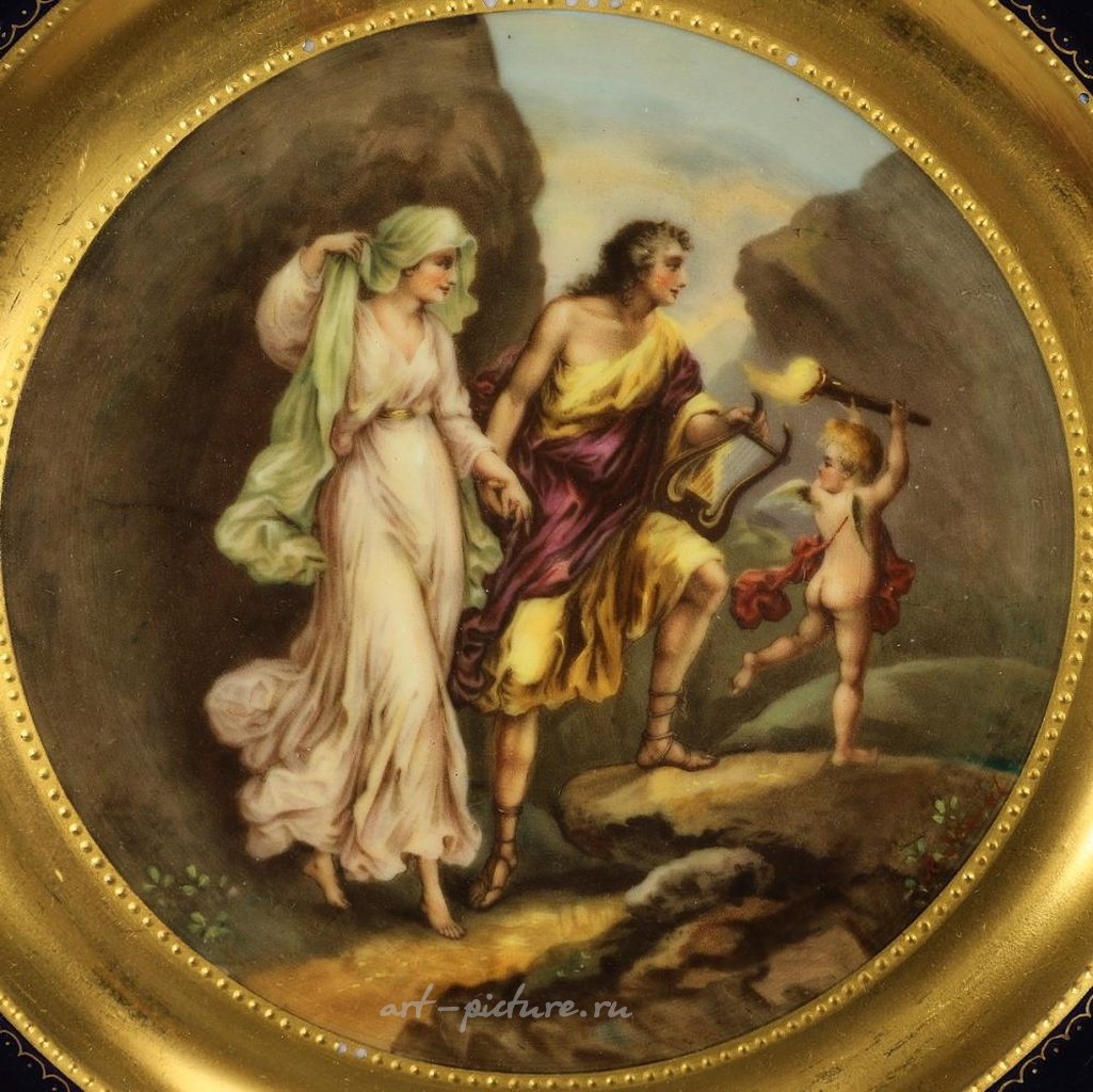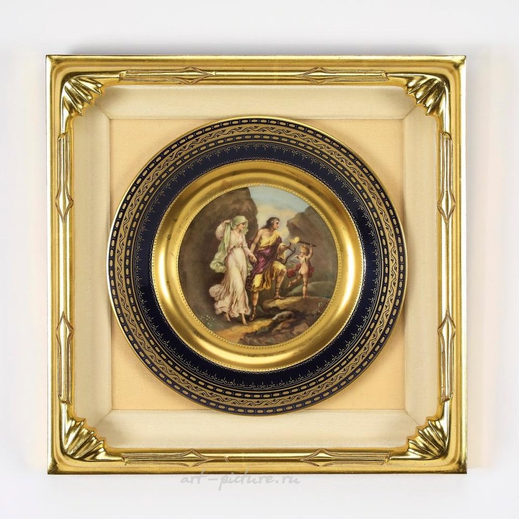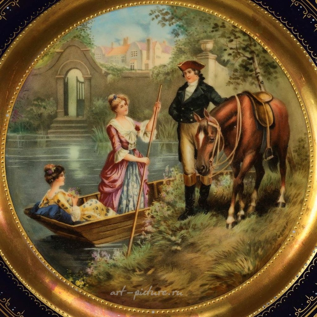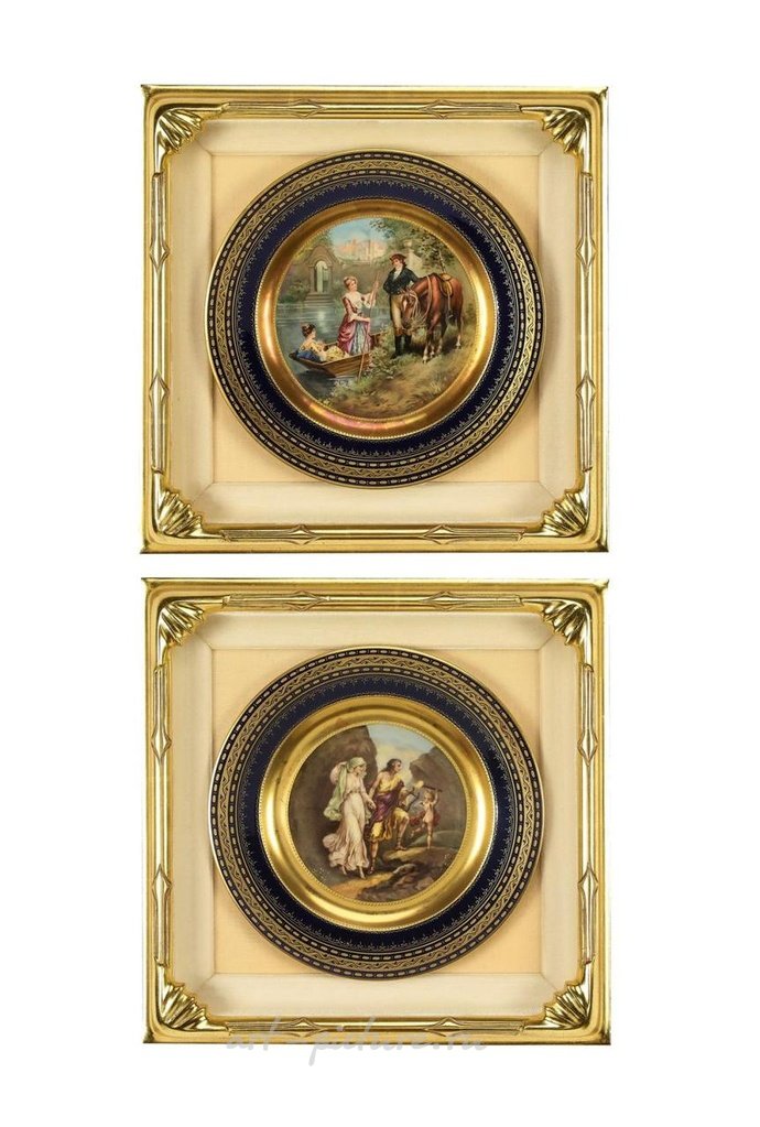 Тарелки, нарисованных вручную,Royal Vienna. Первая изображает пару, одетую в классическую одежду, следующую за Купидоном, который ведет их факелом. Тарелка подписана "Р. Старал" и украшена позолотой и кобальтовыми полосами. Вторая тарелка изображает двух девушек, одетых в одежду 18 века, которые гребут лодку по буколической реке, в то время как человек и его лошадь наблюдают с берега. Тарелка подписана "И. Вагнер" и также украшена позолотой и кобальтовыми полосами. Обе тарелки находятся в индивидуальных теневых рамках. Диаметр тарелок составляет 10,5 дюйма, размер рам - 15 на 15 дюймов.