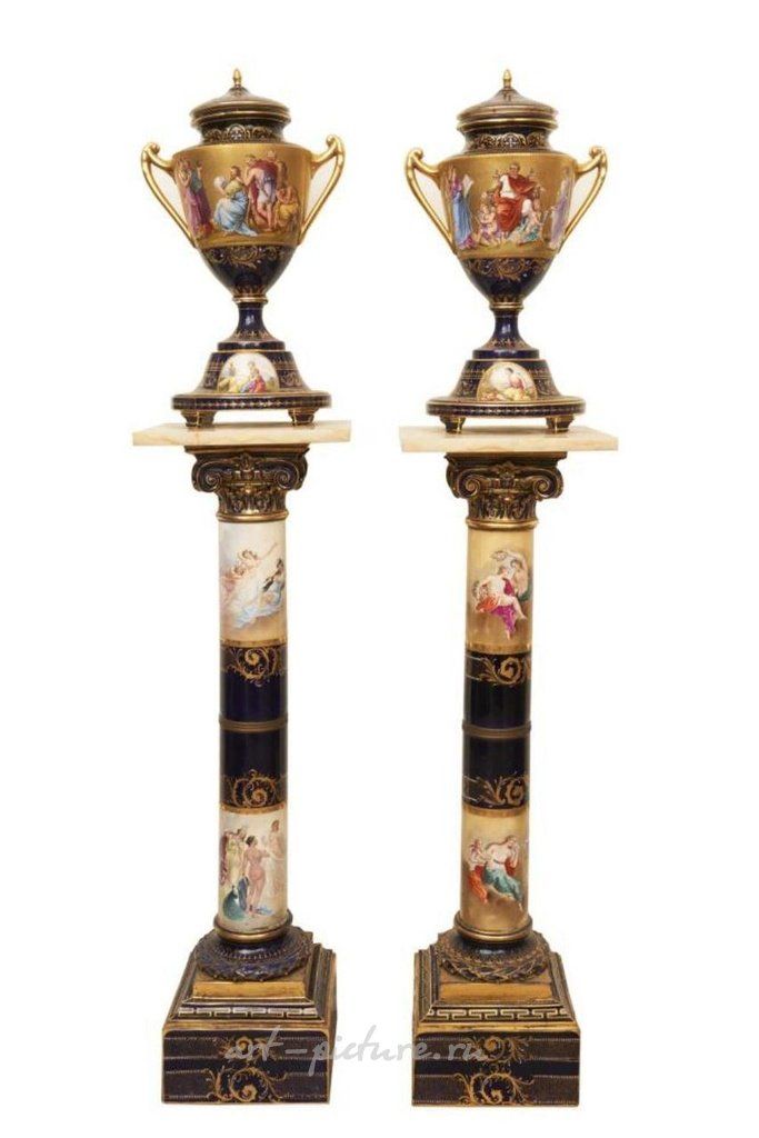 Пара покрытых ваз и пьедесталов. Каждая двухручная ваза украшена фризом классических фигур на богато позолоченной ювелирной решетке и кобальтово-синем фоне, установлена на квадратном основании с порядковой ступенькой и имеет синие пасеки. В комплекте также есть пара соответствующих пьедесталов. Вазы восстановлены (4).