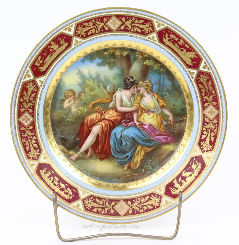 Прекрасная фарфоровая кабинетная тарелка Royal Vienna, расписанная вручную с изображением классической сцены "Юпитер и Каллисто" и подписанная художником. Она окружена золочеными рельефными эмалевыми панелями. На обороте имеется заводская маркировка синей башни подглазурной росписи. Диаметр тарелки составляет 9,5 дюйма.