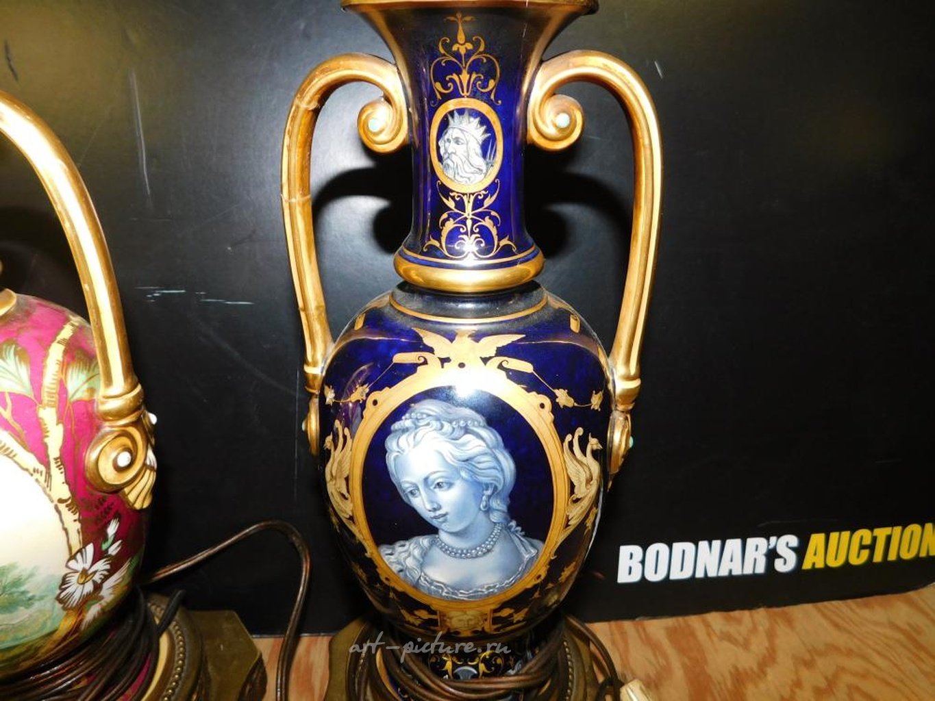 Пара ручных ваз 19 века, преобразованных в лампы. Синяя урна из кобальтового стекла - ручки отремонтированы. В стиле Лиможа или королевской Вены. Высота - 23 дюйма.