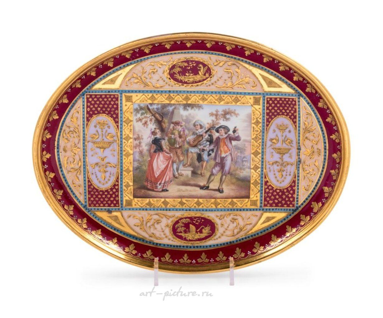 В 19 веке был создан фарфоровый лоток Royal Vienna который был расписан и позолочен. Его ширина составляет 10 3/4 дюйма.