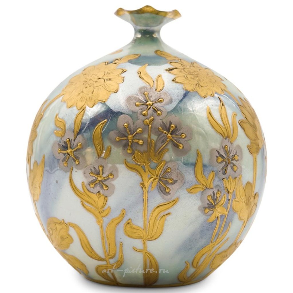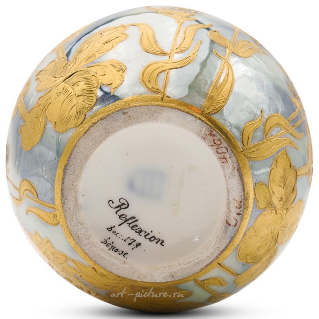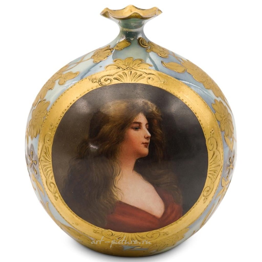 ОПИСАНИЕ: Старинная фарфоровая ваза Royal Vienna. Имеет фарфоровое основание с центральными эмалью покрытыми классическими женскими фигурами. С отделкой из изысканного золота и цветочных элементов. Помечена снизу надписью "Reflexion, Sex 179, bellose" с голубой печатью королевского Вены. ПРОИСХОЖДЕНИЕ: Германия. РАЗМЕРЫ: Высота: 4,25 дюйма x Диаметр: 3,75 дюйма. СОСТОЯНИЕ: Отличное состояние.