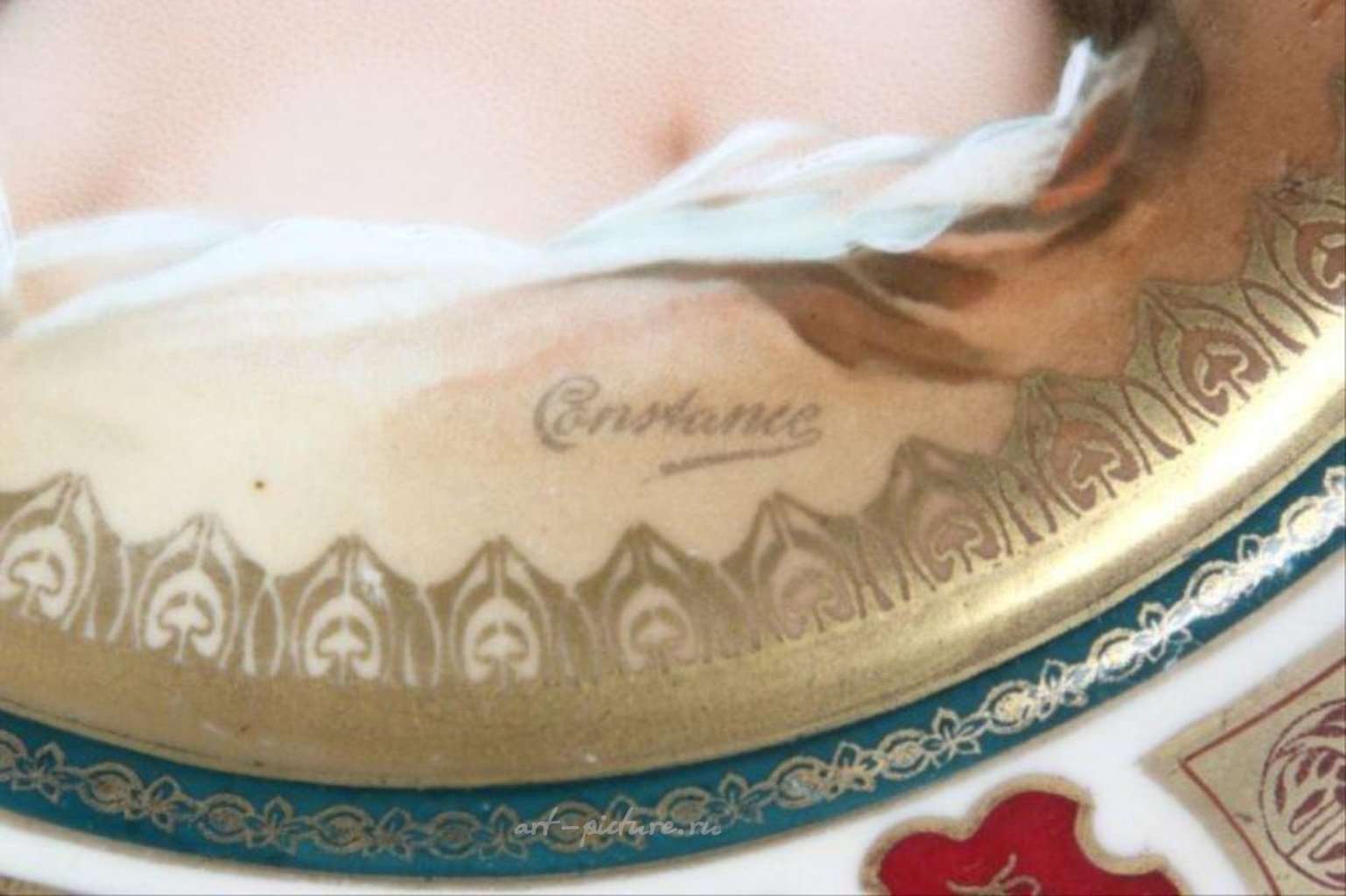 Венская фарфоровая тарелка Royal Vienna. На ней изображен портрет женщины с переводным декором, подпись внизу справа "Constance". Тарелка имеет красную, зеленую и позолоченную ободку, а также подписи "Wheelock Vienna" и пчелиный штамп. На рисунке есть некоторые царапины, а на внешней кромке обода - 5 старых шероховатостей. Компания Du Paquier начала производство венского фарфора в 1718 году, что сделало Вену вторым по старшинству производителем твердопластичного фарфора в Европе. В 1744 году, столкнувшись с финансовыми трудностями, дю Пакье продал свою компанию императрице Марии Терезии, члену австрийской королевской семьи, которая основала Императорскую и Королевскую фарфоровую мануфактуру, или Королевскую Вену. На протяжении более столетия Royal Vienna производила прекрасные рококо и неоклассические изделия, часто изображающие жанровые сцены известных современных художников. Однако Самуэль Штётцель из Мейсена быстро предал своего работодателя и продал тщательно охраняемую им секретную технологию - использование каолина, или китайской глины, для венского фарфора Клаудиусу Иннокентию дю Пакье.