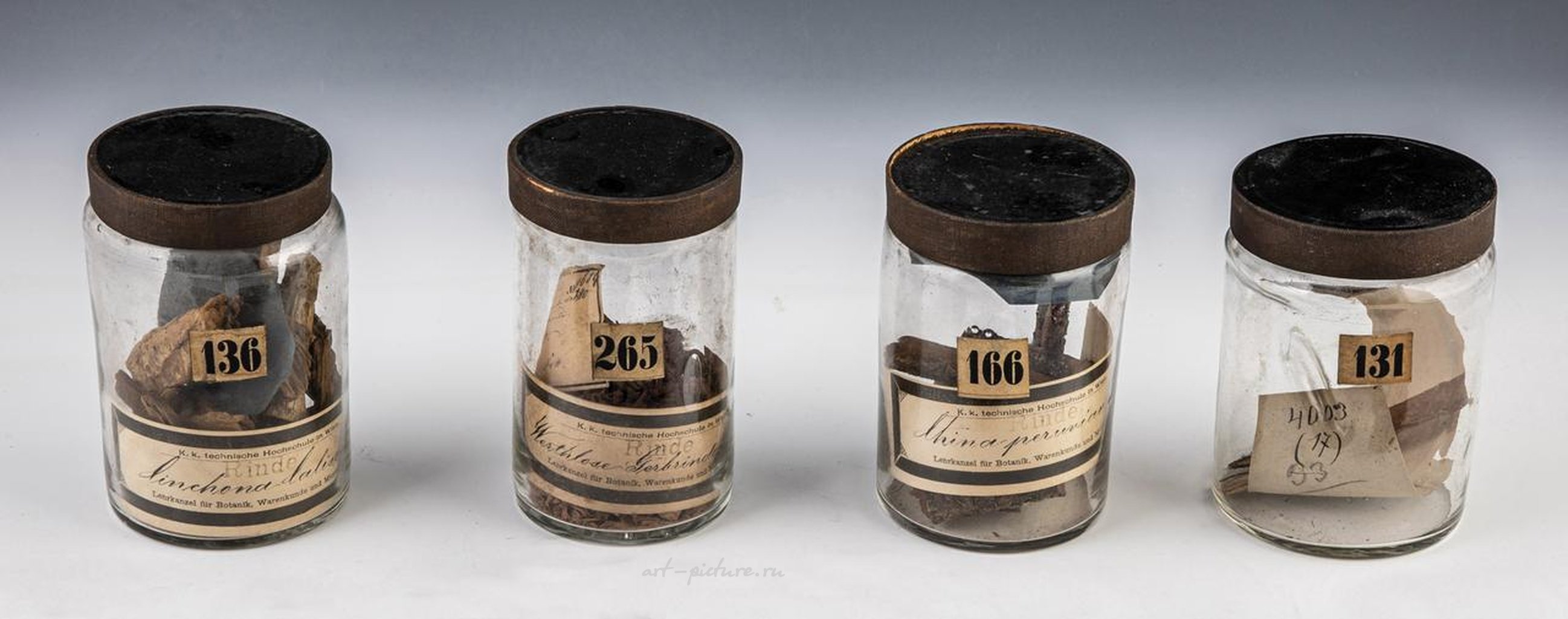 Четыре стакана из Австрии, 19 век. Это стеклянные стаканы, суженные ниже рта. Они имеют содержимое и распечатанные вставки с рукописными названиями. Крышки выполнены из бумажной маши. Высота составляет от 11,2 до 12,1 см. Эти стаканы находятся в коллекции Ботанического отдела Императорского и Королевского Технического Университета в Вене.