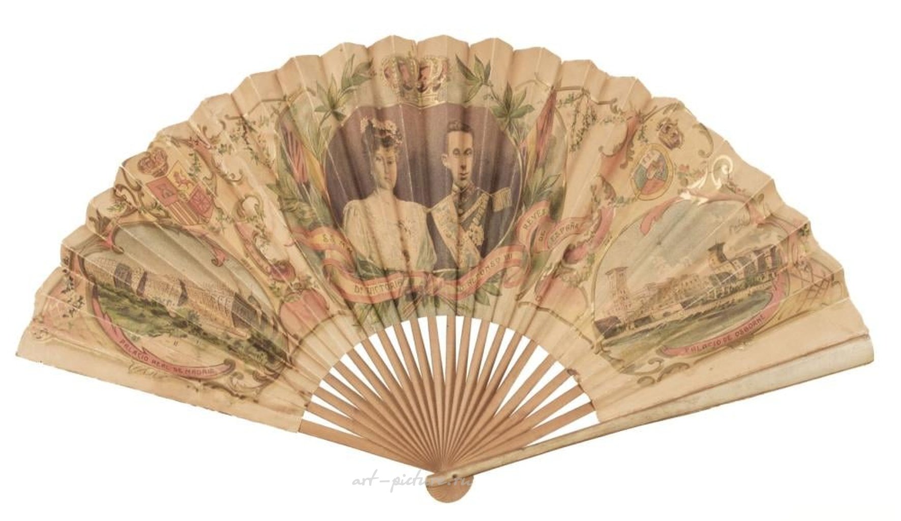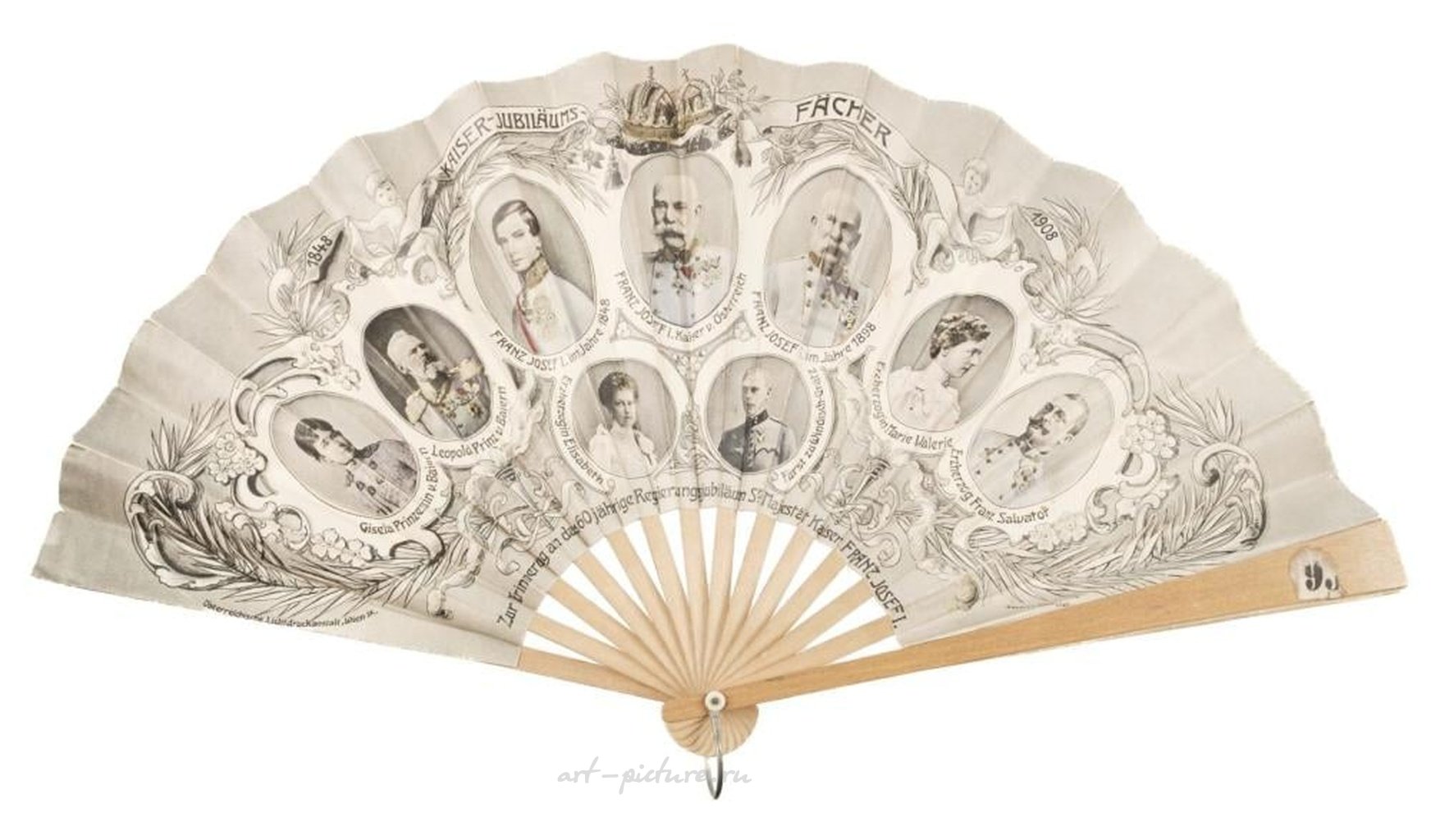 Королевство. Веер, посвященный 50-летию Франца Иосифа I Австрийского, Вена, 1898 год. Веер, посвященный 50-летию Франца Иосифа I Австрийского, Вена: Schmutterer & Co., 1898 год. Складной веер из бумажного фонтажа, литографированный в золотых и цветных тонах с королевским гербовым трофеем, держащими его пути над городским пейзажем и надписью-карточкой, окруженной овальными портретами императора, выполненными E. Döcker. Некоторые небольшие царапины и слегка помятый верхний край. Монтирован на деревянные палочки. Размер: 32,5 см (12,75 дюймов). Вместе с двумя другими складными бумажными веерами, один из которых посвящен 60-летию Франца Иосифа I Австрийского, а другой отмечает брак короля Альфонсо XIII Испанского с Викторией Евгенией Баттенбергской (некоторые износ и ремонты). Оба монтированы на деревянные палочки. Количество: 3.