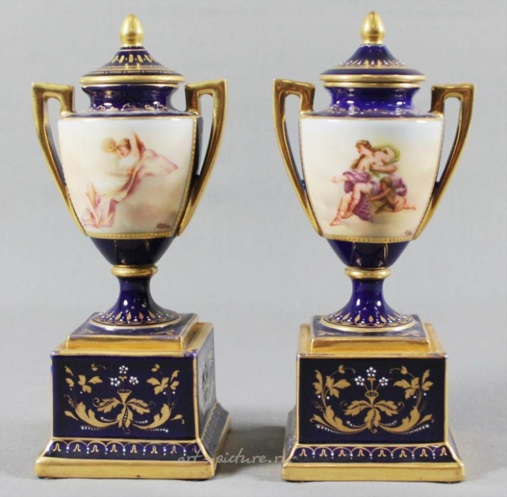 Пара покрытых кубков из фарфора Royal Vienna. Размеры: Высота: 8 дюймов, Ширина: 3 3/4 дюйма. Ду Пакье начал производство венского фарфора в 1718 году, что сделало Вену вторым старейшим производителем фарфора в Европе. В 1744 году, столкнувшись с финансовыми трудностями, Ду Пакье продал свою компанию императрице Марии Терезии, члену австрийской королевской семьи, которая создала Императорскую и Королевскую фарфоровую мануфактуру, или Royal Vienna. На протяжении более столетия Royal Vienna производила красивые изделия в стиле рококо и неоклассики, часто изображая жанровые сцены известных современных художников. Однако Самуэль Штцель из Мейсена быстро предал своего работодателя и продал хорошо охраняемую тайну компании - использование каолина, или китайской глины, Иннокентию Ду Пакье из Вены.