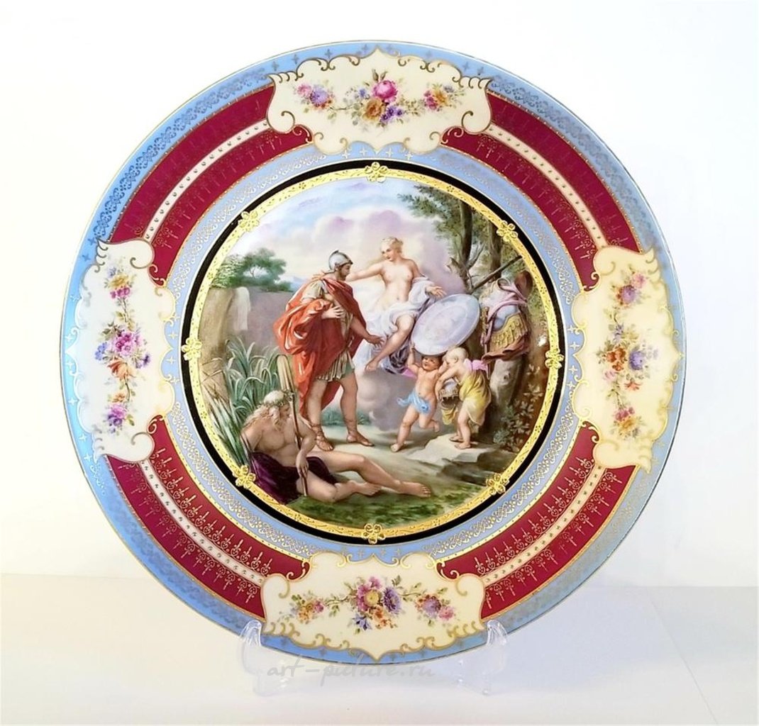 Большая антикварная фарфоровая тарелка Королевского Вены. Ручная роспись. Помечена снизу королевским венским гербом и номерами под глазурью. Диаметр 15 дюймов (38 см). Состояние отличное.