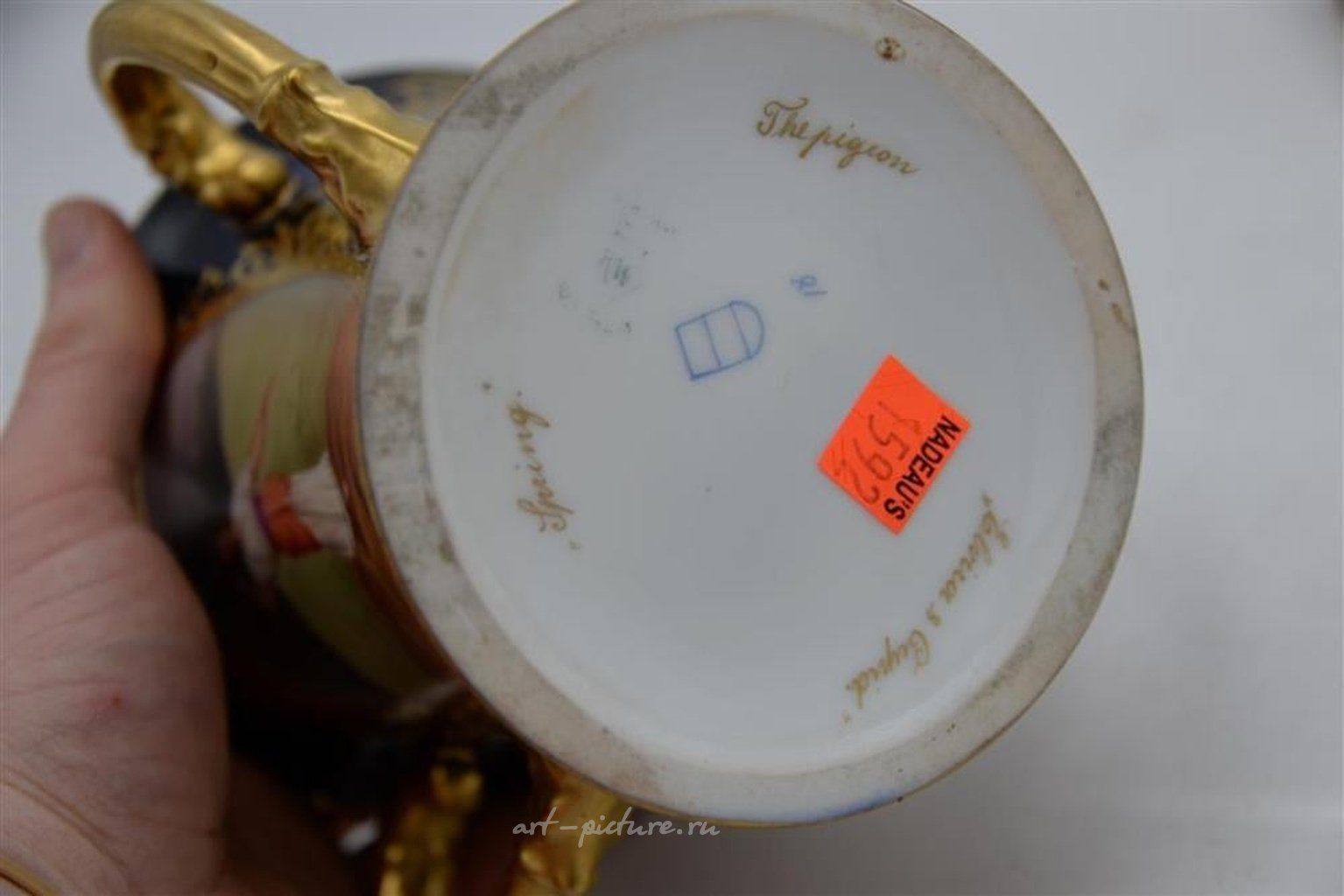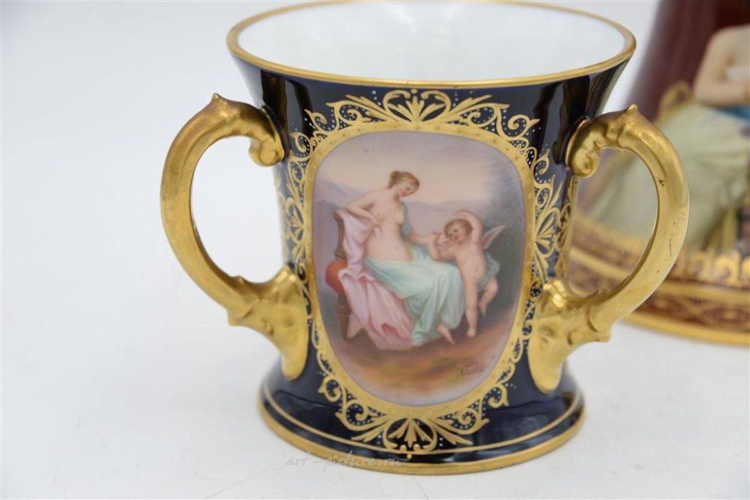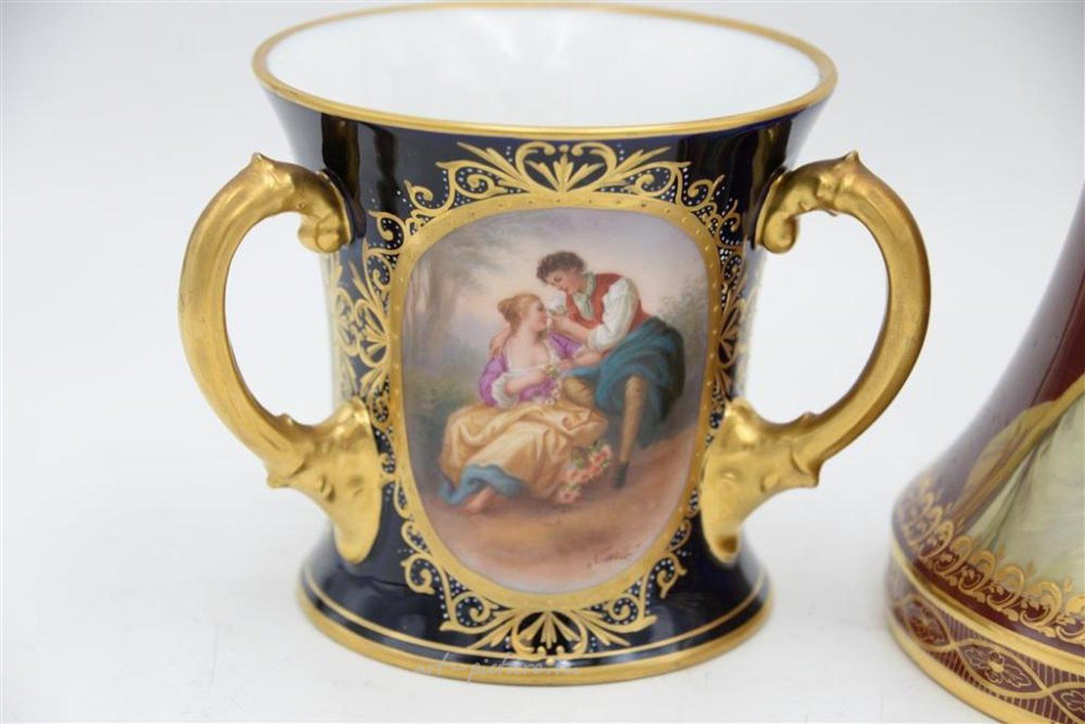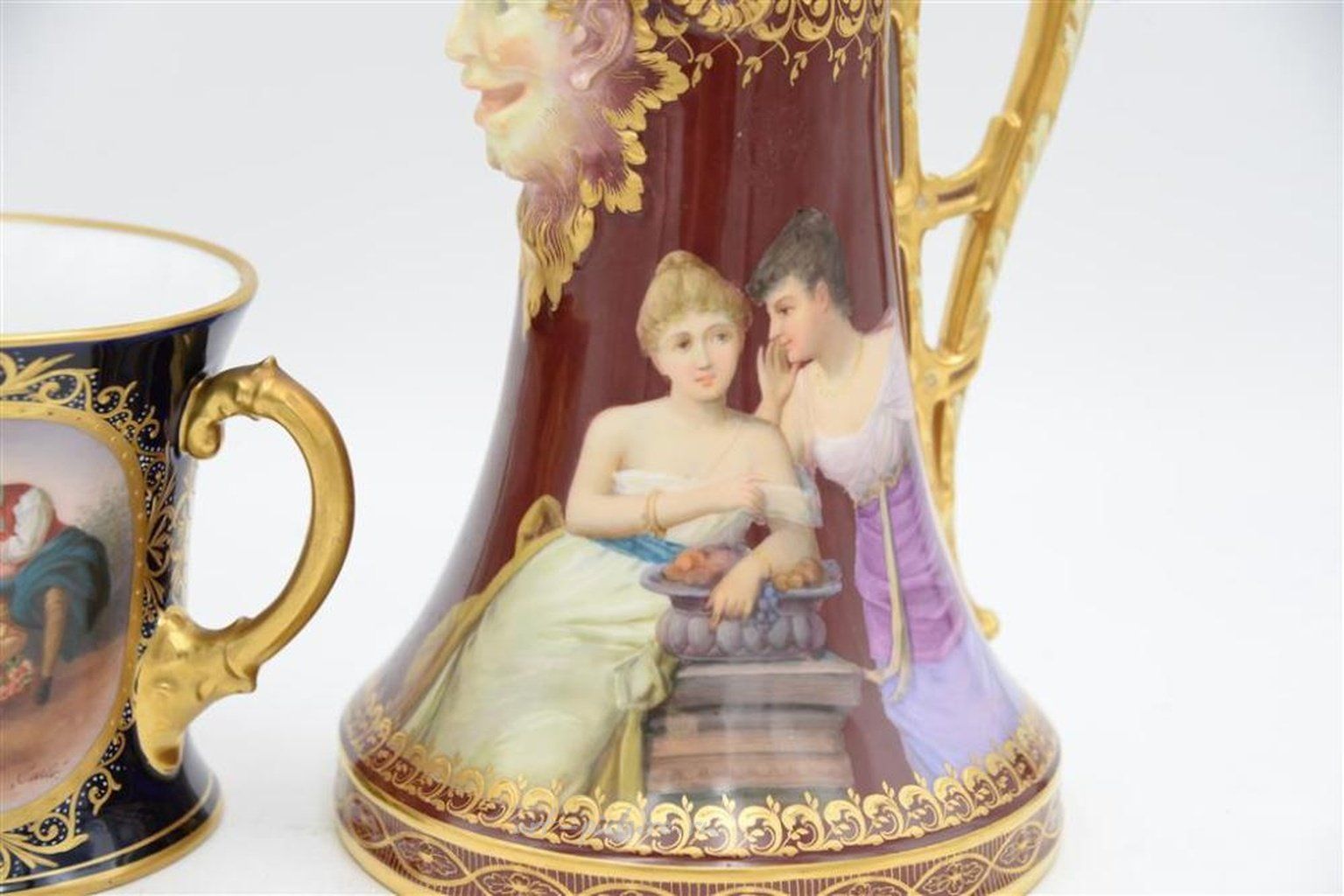 Два предмета из фарфора Королевского Вены включают графин с маской излива и ручкой, с портретом двух женщин, подписанным художником внизу справа "Джонс", а также инвертированный королевский улей Королевского Вены, названный "Геймнис", высотой 11 дюймов. Вместе с этими предметами идет трехручечная кружка для любимого, с тремя сценами: "Голубь", "Весна" и "Купидон Эльвиры", подписанными "Карло", высотой 5 1/2 дюйма.