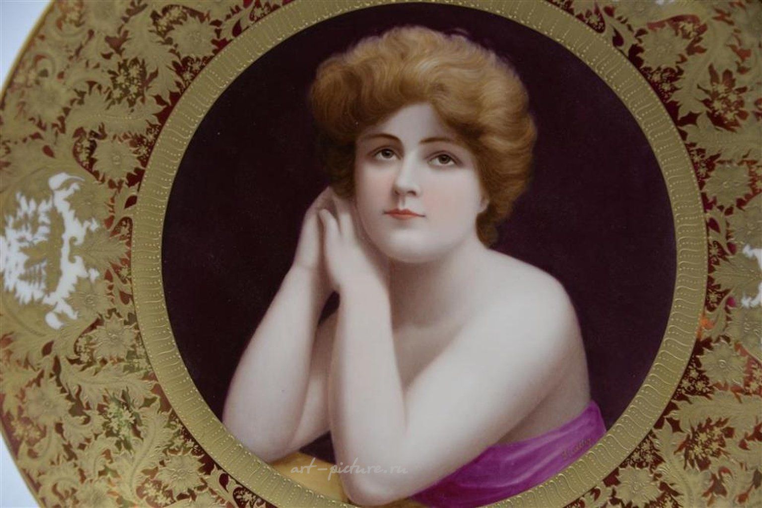 Глубокое блюдце Royal Vienna с ручной росписью женщины, подписанное художником, с высоким рельефным краем, размером 13 1/2 дюйма.