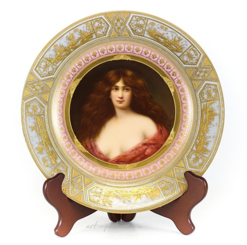 Королевская венская кабинетная тарелка с ручной росписью, подписанная Р. Верлихом. C1890 год. На тарелке изображены драгоценные и рельефные сцены, а также узоры с позолотой по ободу. На рисунке изображена молодая женщина в розовом платье с рыжими волосами. Тарелка имеет подглазурную марку улья. Вес составляет около 1,25 фунта. Приблизительные размеры: диаметр 9,5 дюймов. Стоимость доставки по стране: $25.