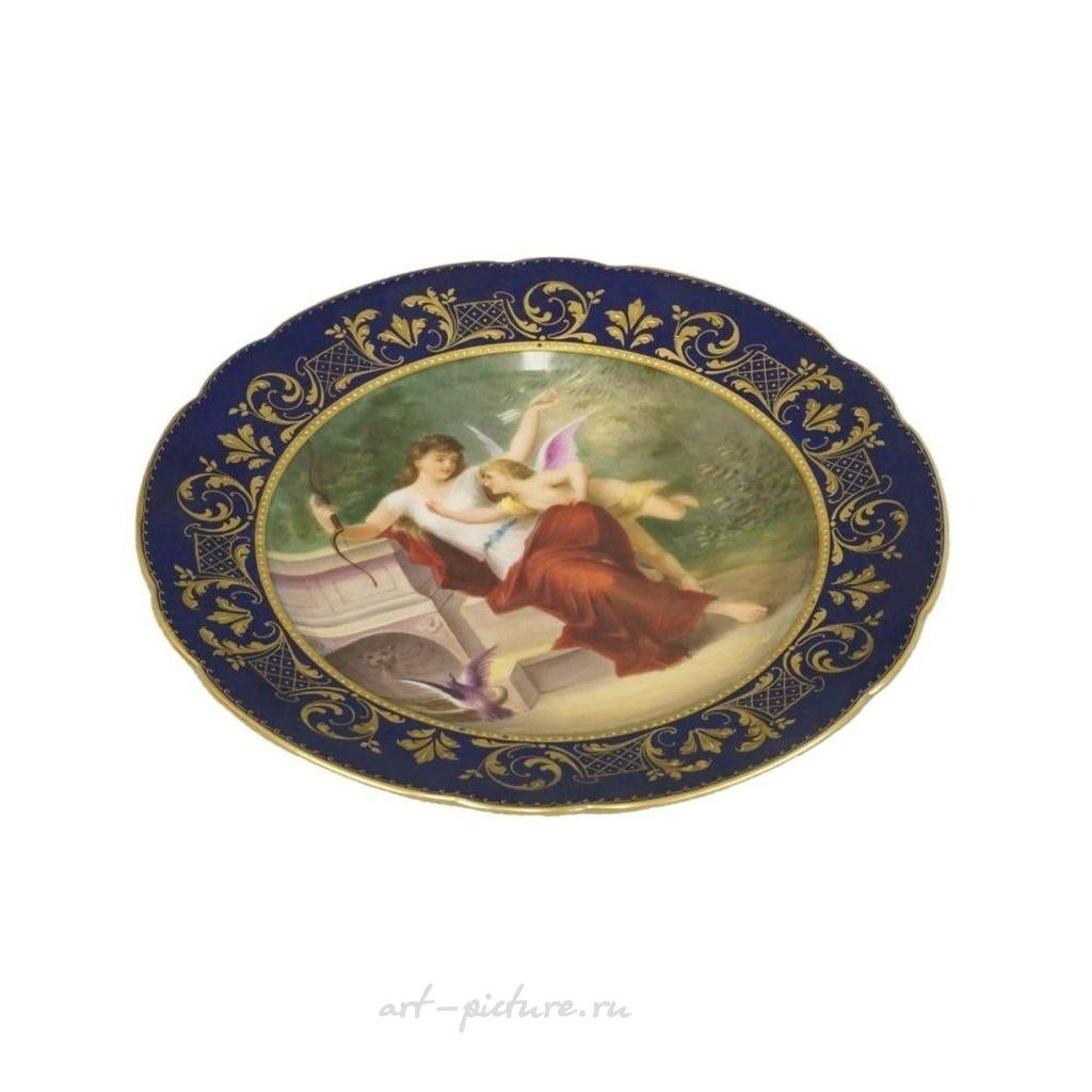 В 19-м веке была создана королевская венская фарфоровая кабинетная тарелка "Amor Entraffnet". Она выполнена в золочении и кобальтовом цвете. На нижней стороне имеется марка пчелового улья и пометка "Entraffnet". На портретной сцене присутствует подпись Шулера. Размеры тарелки: диаметр 7-7/8 дюймов. Оценочная стоимость: от $150.00 до $400.00. Доставка по США: $66.00. Состояние товара: хорошее.