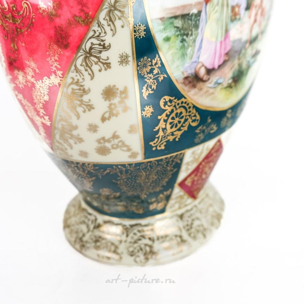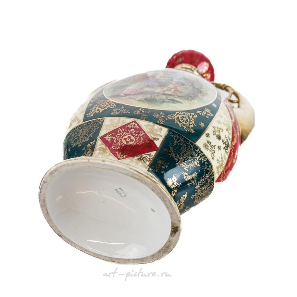 Аффоль и Фрице представляют Королевскую Вену - большую вазу с двумя ручками и ручной росписью в центральной панели. Ее высота составляет 17 1/4 дюйма, ширина - 11 дюймов, а глубина - 5 1/4 дюйма. На ручках и основании имеются незначительные следы истирания золочения, однако в остальном она находится в хорошем состоянии.