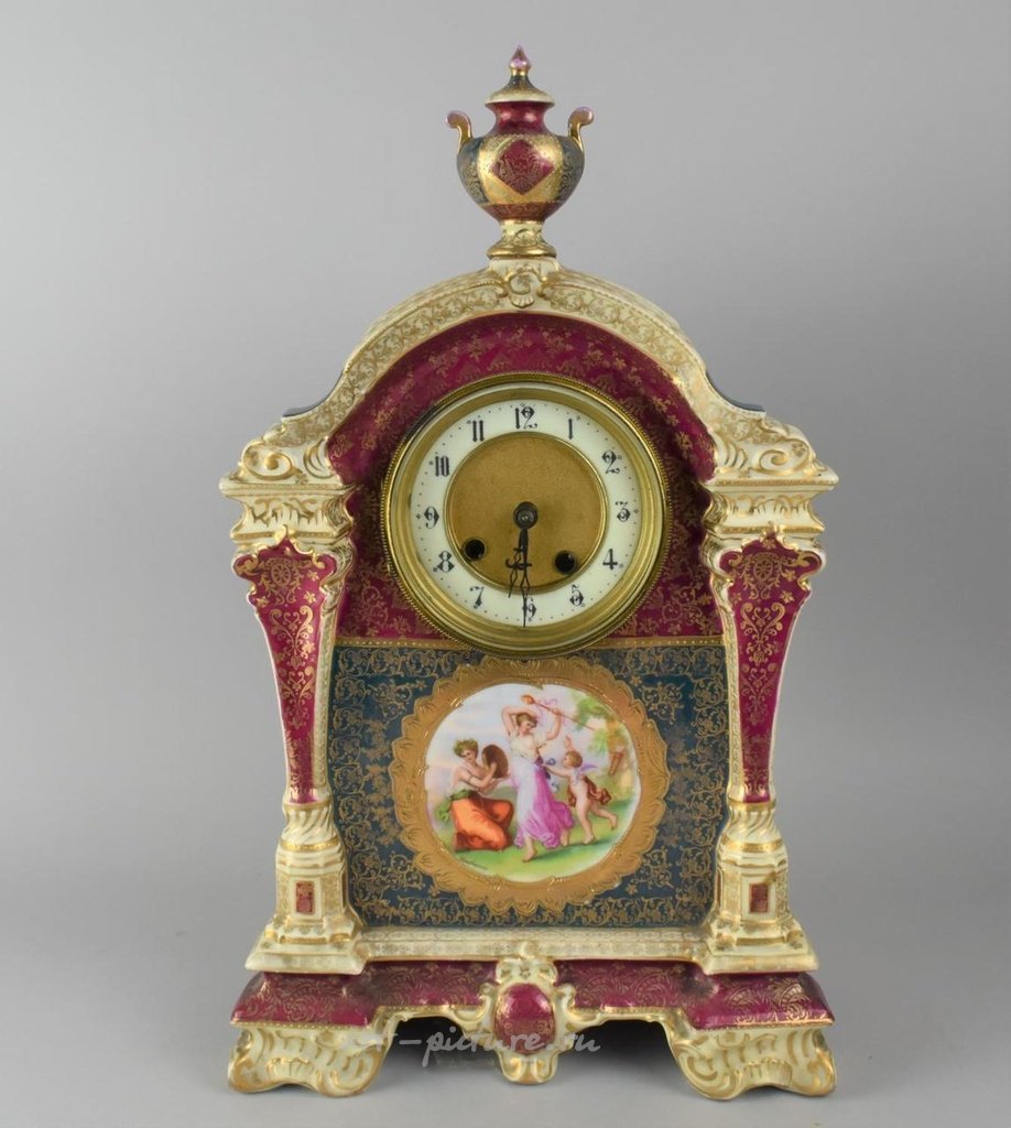 Царская венская керамическая настольная часовня с уникальной оправой украшена ручной росписью в классическом стиле и имеет центральный герб. Высота часовни составляет 45 см.