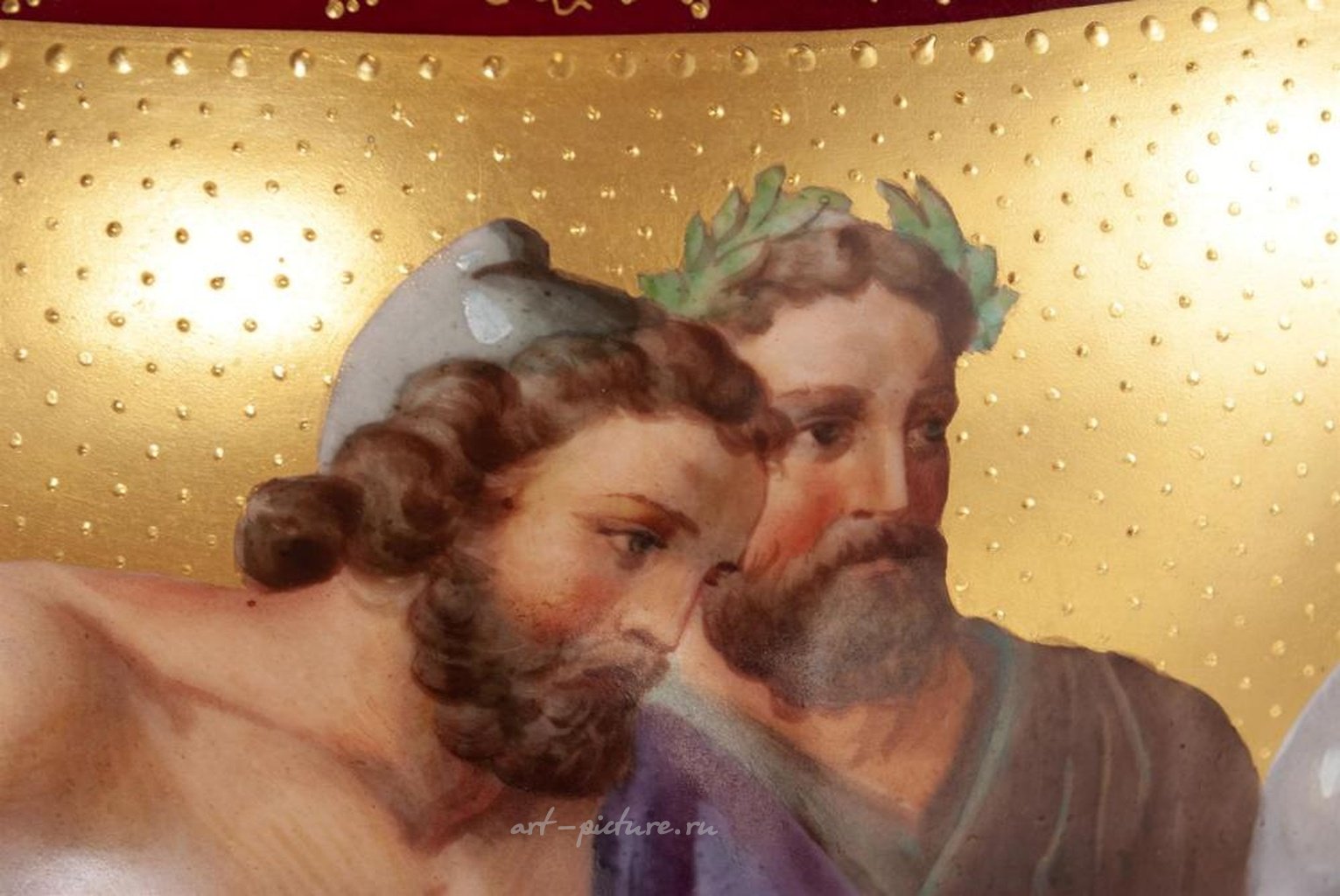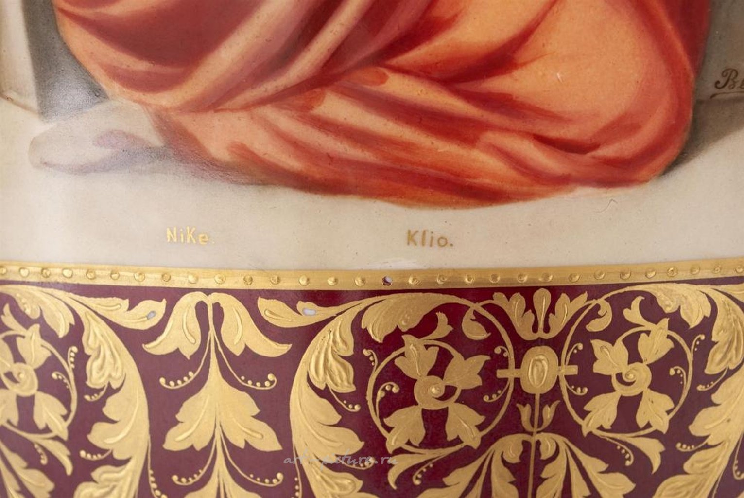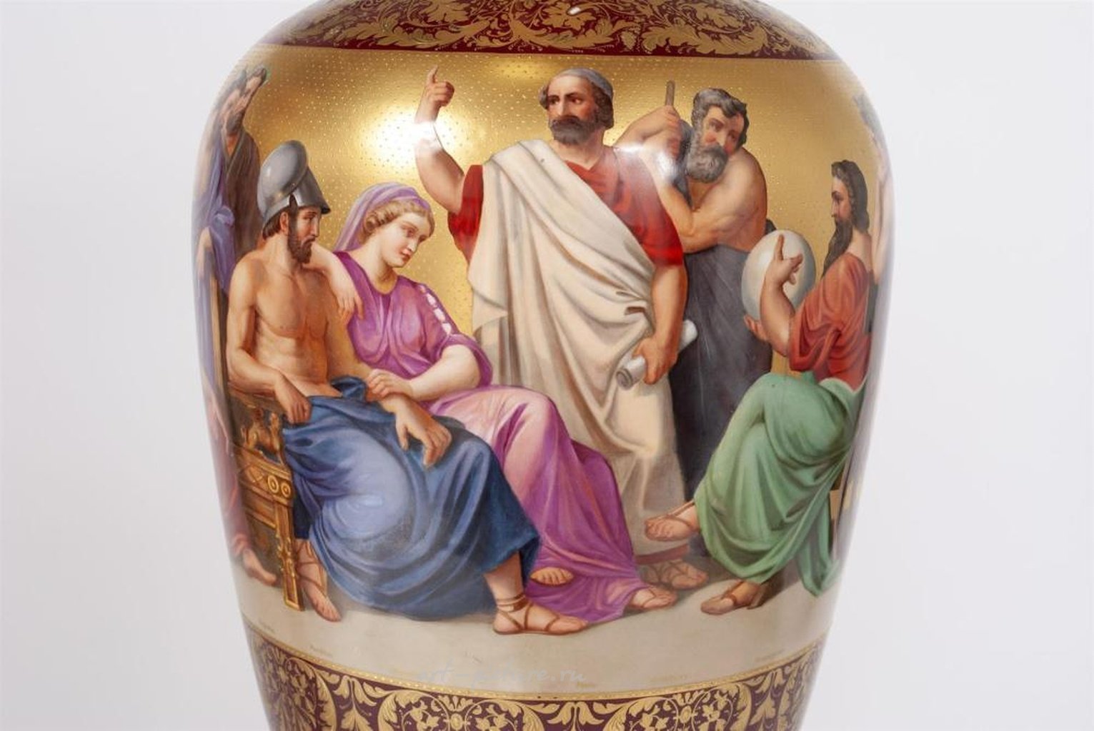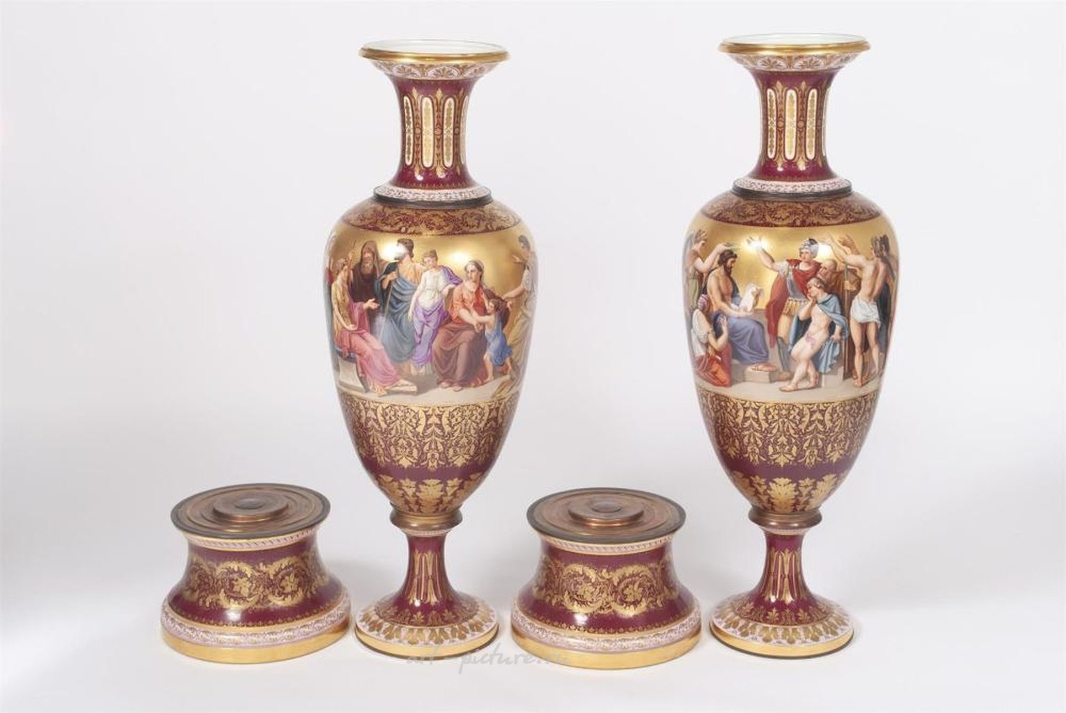 Пара монументальных фарфоровых ваз Королевского Вены. Произведены в конце 19 века на континентальной Европе. Имеют марку "Пчелиный улей" и ручную роспись, обе подписаны "Беер". Основа выполнена из латуни и имеет отметку Карла Радлера (Иосиф Карл Редлер, 1844–1917). Урны имеют балюстровую форму на соответствующих круглых основаниях и украшены изображением золотистого растительного узора на глубоком красном фоне. Оба основания изготовлены из бронзы и имеют надпись на верхнем ободе: "Золотой век греческой культурной истории по Рахлю". Фризы, окружающие фигуральные панели, изображают самых важных и влиятельных греческих философов, математиков, поэтов, ораторов и лидеров V-III веков до н.э., которые сочувствуют друг другу. Под каждым изображением указано имя. Один из сосудов изображает фигуры Ксенофонта, Фукидида, Диагорида, Сократа, Фидия, Софокла, Перикла, Аспасии, Платона, Антисфена, Анаксагора, Алкивиада, Гетинуса, Полигнота, Архимеда, Ники, Клио и Геродота. Вторая урна содержит изображения Сапфо, Олимпии, Филадельфии, Птолемея, Аристарха, Эратосфена, Теокрита, Демостенеса, Стратона, Теофраста, Аристотеля, Деметрия, Фалерея, Александра, Солона и Александра II. Высота урн составляет 46,5 дюймов.