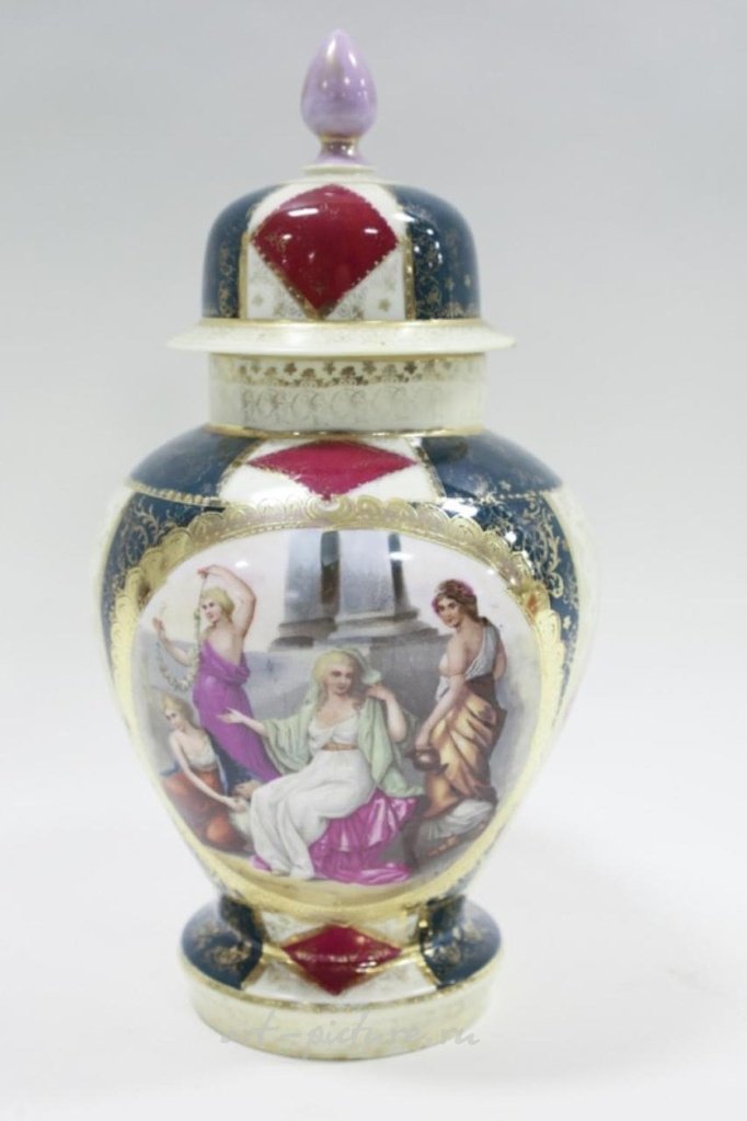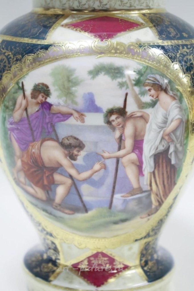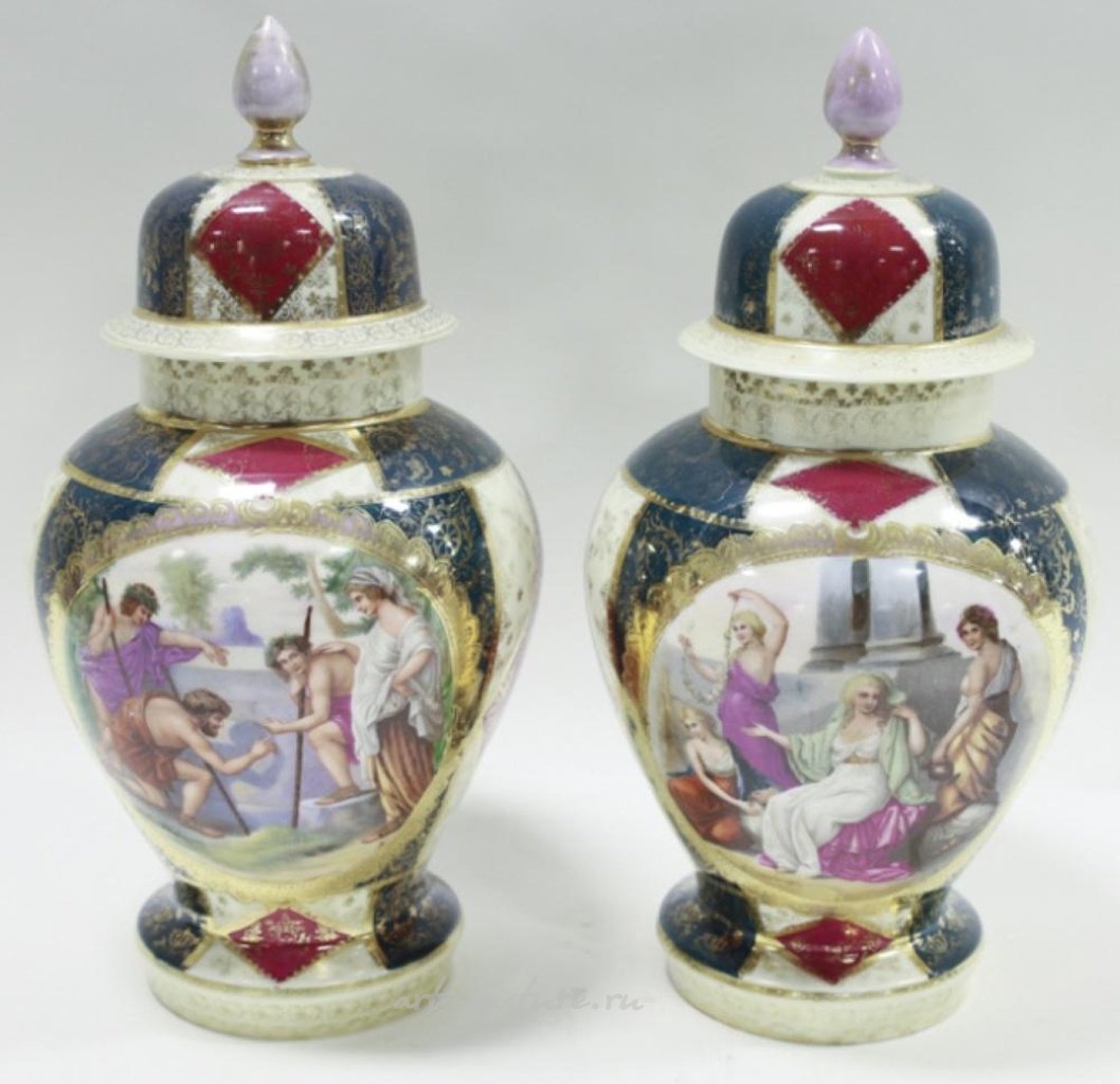 Предлагаемая пара портретных фарфоровых сосудов из Королевской Вены является отличным выбором. Сосуды выполнены из фарфора и имеют высоту 14-3/4" вместе с крышками. Они также украшены клеймом в виде пчелового улья. Сосуды находятся в хорошем состоянии, однако имеют некоторые потертости краски и золота.
