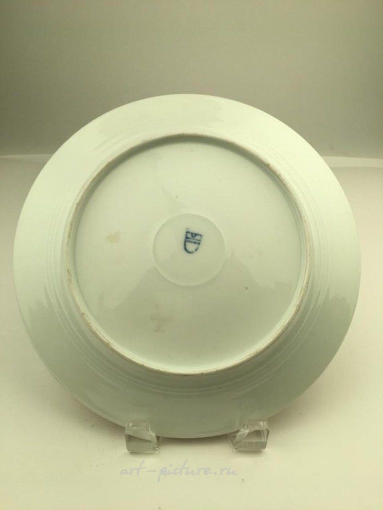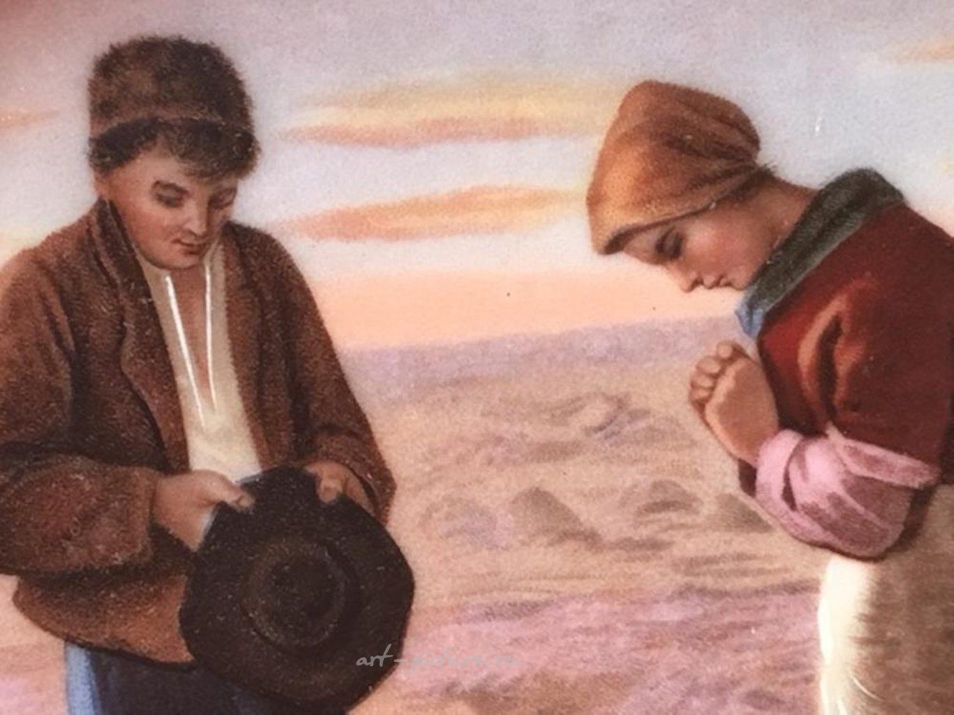 Королевский венский кабинетный салатник для тарелок с золотой эмалевой окантовкой. На изображении видно мужчину и женщину во время молитвы, рядом с ними находится корзина с моллюсками, тележка и вилка для моллюсков. Задняя сторона салатника украшена отметкой с королевским пчелиным ульем. Диаметр составляет 9 9/16 дюйма.