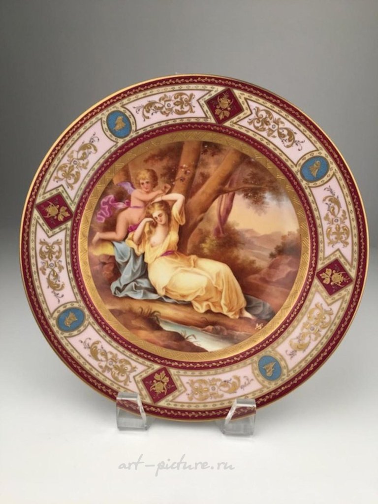 Фарфоровая тарелка Royal Vienna с изображением лежащей женщины и крылатого ребенка в саду, окруженном золотой гравированной рамкой, отмечена пчелиным маркером. На тарелке также написано "Nevus Gefesselt". Диаметр тарелки составляет 9 3/8 дюймов.