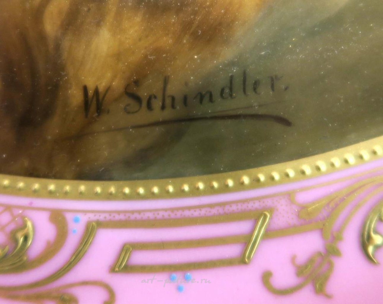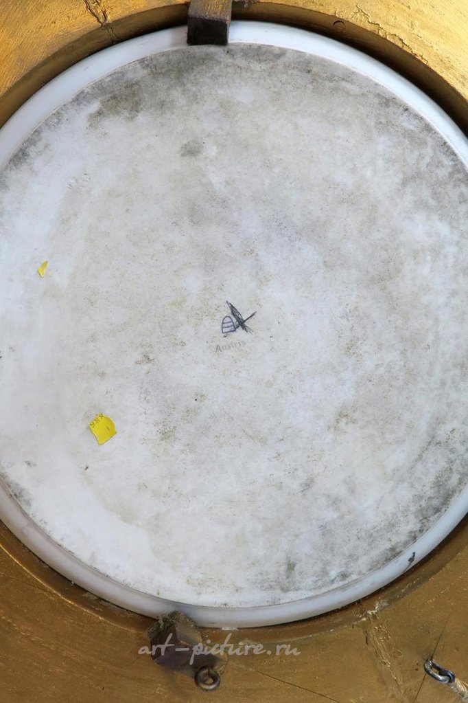 Золоченый столик с фарфоровыми плакетками, произведенный в Австрии в конце 19 века. На центральной панели изображена частично одетая красавица, подпись на плакетке гласит "В. Шиндлер". Столик украшен синей маркой в форме улья и имеет штамп "Австрия" нанесенный чернильным штампом. Вокруг центральной панели расположено пятнадцать овальных плакеток с изображениями красавиц. Основание столика украшено композиционным декором из цветов и ракушек. Столик имеет кабриольные ножки и поперечные растяжки. Его высота составляет 30,1/2 дюйма, а диаметр - также 30,1/2 дюйма.