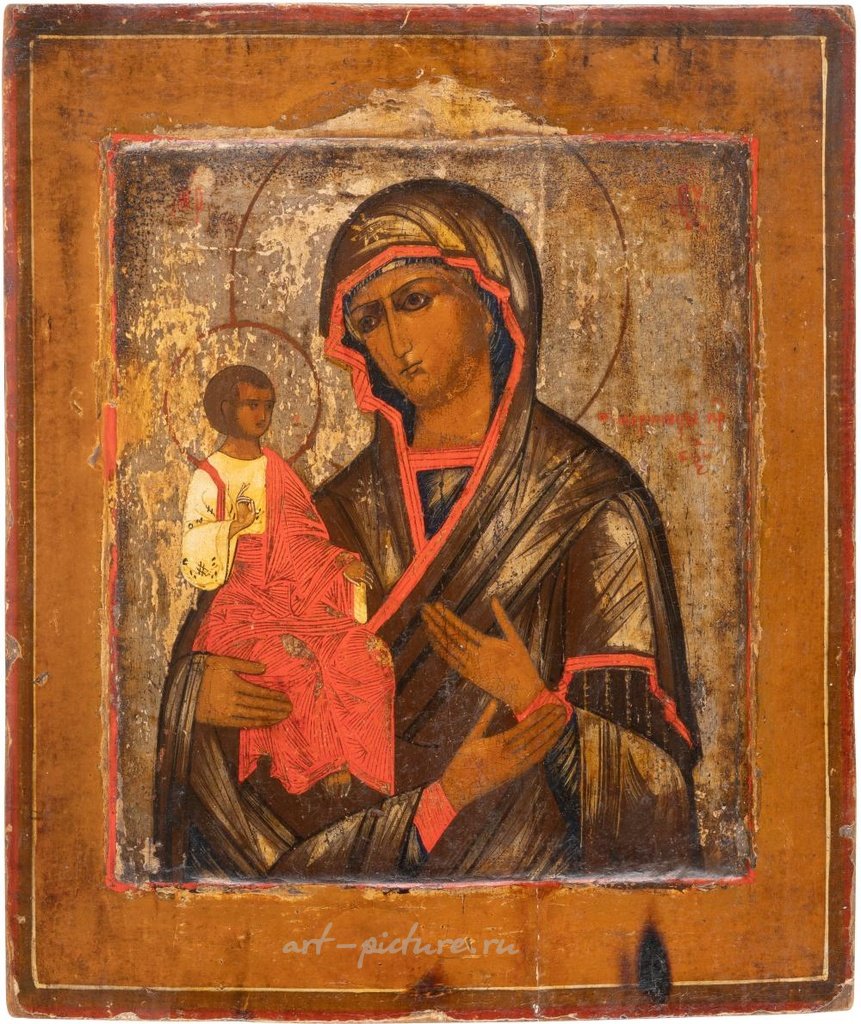 Икона, изображающая Трехрукая Богоматерь, русская, 19 век. Темпера на деревянной панели с ковчегом. Фон выполнен из серебра, покрытого золотым лаком. Износ, вертикальная трещина, частично восстановлена рамка. Размеры 30,8 x 26,2 см. Икона Трехрукая Богоматерь (Трихиреуса), Россия, 19 век. Композит из двух досок с двумя потерянными задними шпонками.