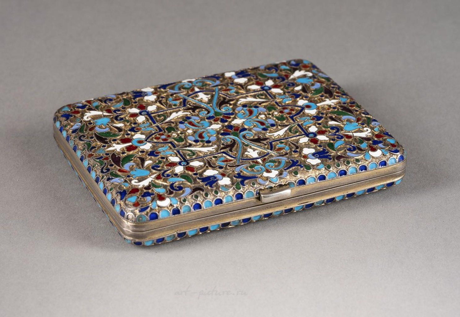 Русский, Москва, Николай Зверев, 1896-1908 гг. прямоугольной формы. Покрытый эмалью с изображением вьющейся листвы на неровном грунте. Маркирован клеймом пробирщика, 84 стандарта и клеймом мастера "NZ" кириллицей. Эмаль с минимальными сколами. Длина 10,4 см, 209 гр.