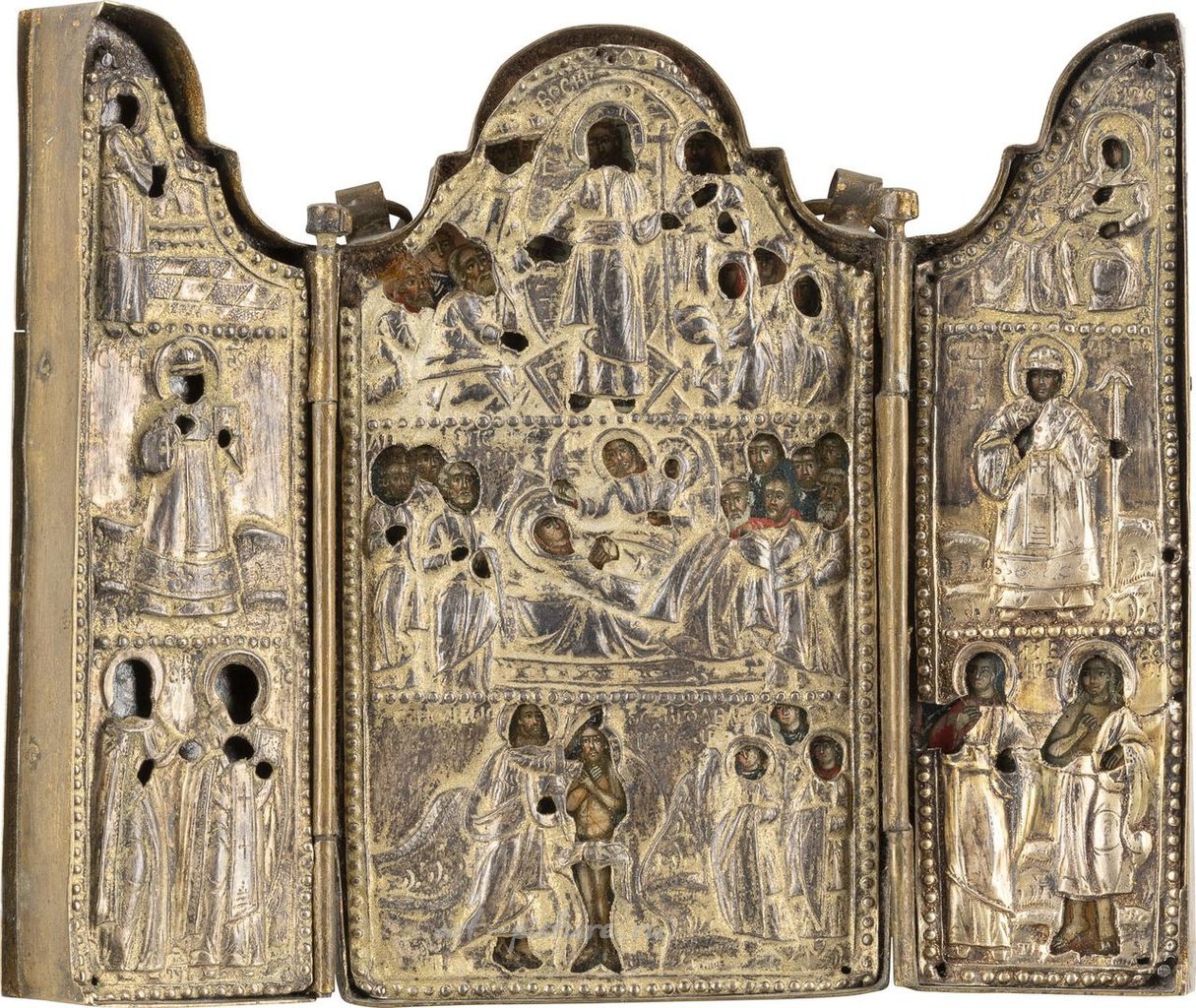 С СЕРЕБРЯНО-ПОЗОЛОЧЕННЫМ ОКЛАДОМ, русская темпера 18 века на деревянных панелях. Обложен чеканными серебряно-позолоченными окладами. Помечено (неразборчиво). Незначительные потери. 15,2 х 18,3 см (увеличено).