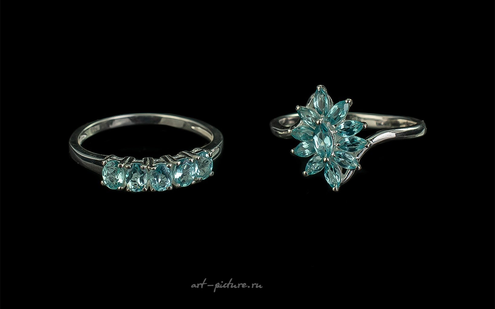 Два кольца с русским апатитом, два контрастных варианта апатита цвета морской волны, одно - элегантная россыпь, в центре которой огранка "маркиза", второе - классический ряд из пяти овальных огранок, плотно прилегающих друг к другу, поперек пальца, оба оправлены в платину vermeil и серебро; размер россыпи S, размер ряда Row
